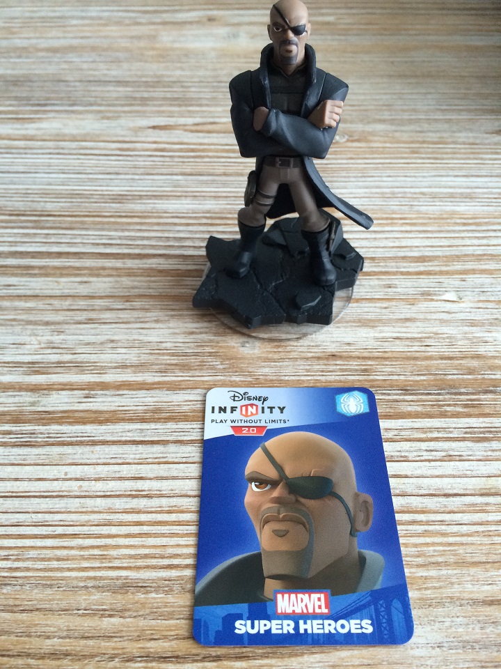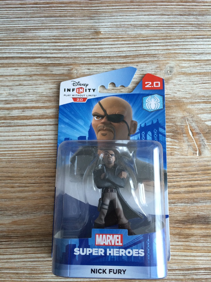 Dernière boite sortie du carton, une Figurine ‘Disney Infinity 2.0’ – Marvel Super Heroes : Nick Fury. Les figurines sont toujours accompagnées d’une fiche de personnage avec un code débloquant du contenu Online. A l’arrière de la boite, un schéma assez clair permet de voir immédiatement avec quel contenu la figurine est compatible.