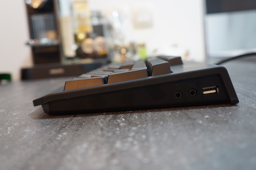 Le Razer Blackwidow Ultimate Chroma propose quelques features intéressantes. Un port USB est intégré au clavier. Ce port USB auto -alimenté par une prise USB permet également d’y brancher un casque avec micro. En effet, des prises casque et micro sont présentes pour connecter le clavier au PC. A noter que le clavier dispose également de 5 touches macro supplémentaires à programmer.