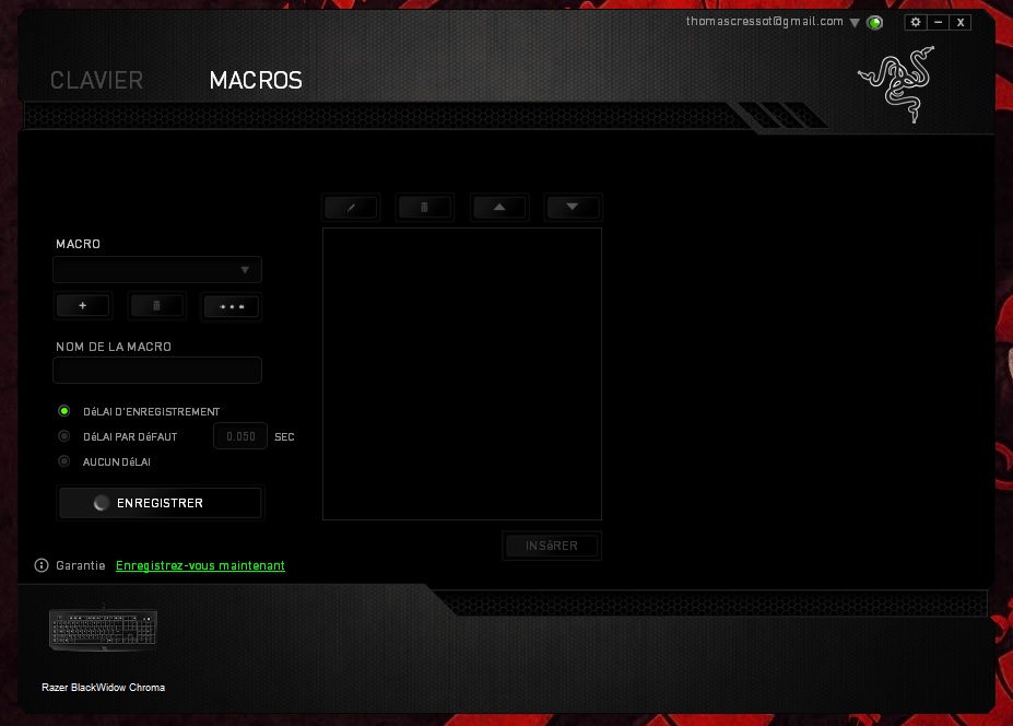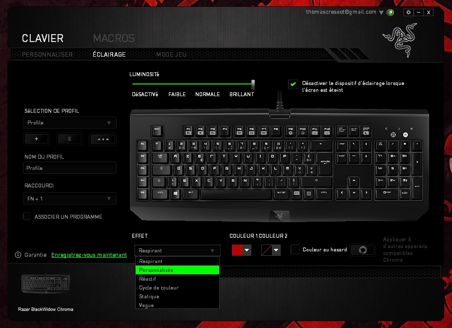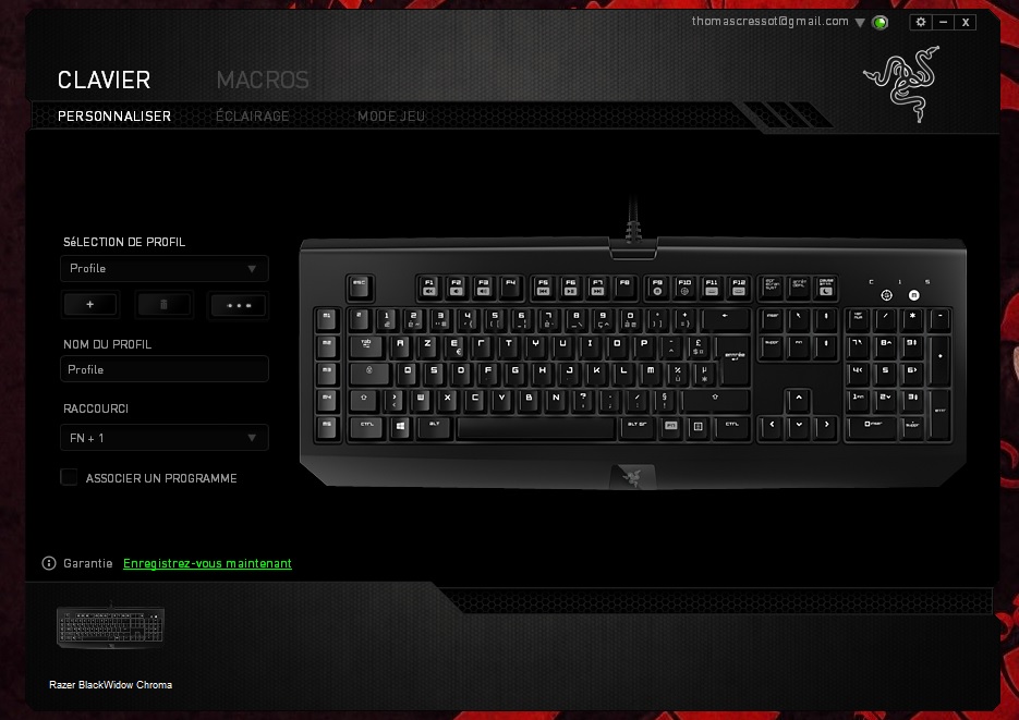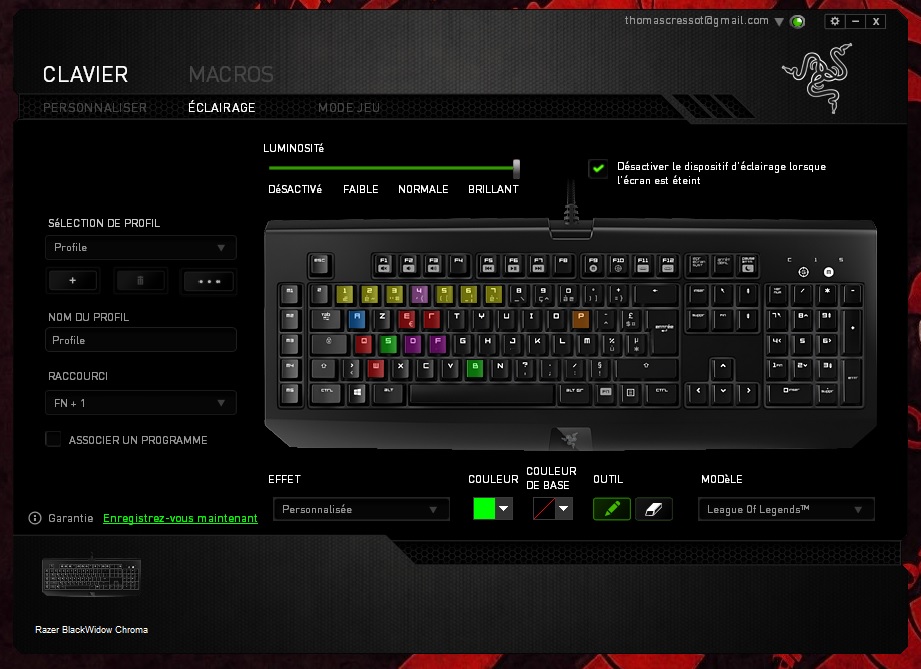 En installant le logiciel officiel Razer Synapse, on a la possibilité de paramétrer son clavier et d’exploiter 100% de ses capacités. Ainsi, on peut configurer l’éclairage de son clavier comme on le désire. L’éclairage de chaque touche étant indépendant, on peut créer son éclairage maison ou encore utiliser un schéma d’éclairage adapté à son jeu préféré. Plusieurs setup sont déjà implémentés comme par exemple pour le jeu Starcraft ou League of Legends. On retrouve également les éclairages classiques suivants fixe, respiration ou alterné. Enfin, c’est par là qu’il faudra passer pour créer des macros ou paramétrer les touches programmables.