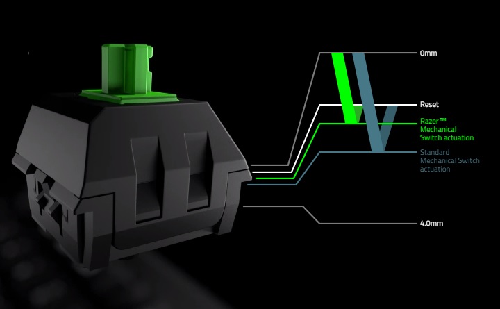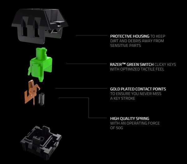 Il existe deux types de touches mécaniques Razer : la touche Razer verte, tactile et « clicky », nécessitant une force d’activation de 50 g et la touche Razer orange, tactile mais silencieuse, nécessitant une force d’activation de 45 g. Celles que j’ai testées étaient la version Razer Green, soit la plus bruyante. Et effectivement, ce clavier fait un boucan d’enfer à tel point que ma femme s’en est plainte en regardant un film dans la pièce d’à coté. Le bruit est double. On a le bruit de la touche et le cliquetis du ressort indiquant l’activation (et la désactivation de la touche). Cela peut être un repaire sonore pour le joueur qui apprivoise son clavier mais dans les faits c’est juste chiant.