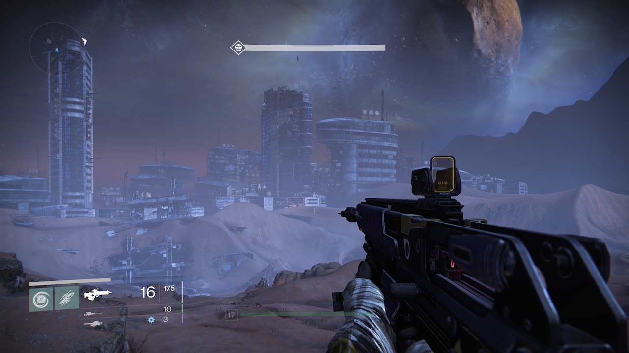 Destiny, c’est avant tout Bungie, un studio qui a fait ses preuves dans la SF avec la série Halo. Une fois encore, on est projeté dans un monde où la direction artistique tout en maîtrise nous en met plein la vue. Esprit tutélaire, voyages spatiaux, machines destructrices, humanité au bord de l’extinction, tous les éléments d’une bonne série ou d’un film de science-fiction sont réunis. Dans Destiny, on incarne un gardien qui doit protéger le voyageur et l’humanité. Le voyageur est un énorme artefact endormi qui a offert de nombreuses connaissances aux humains dont celles qui leur a permis de voyager dans l’espace. Symbole d’une lumière qui vacille, le voyageur est sous la menace des ténèbres incarnée par les déchus. Une race d’extraterrestre qui vont de monde en monde, annihilant toutes vies non soumises sur leur passage. Bref, un postulat on ne peut plus classique en science-fiction mais qui permet de poser les bases d’une aventure qui va se complexifier par la suite.