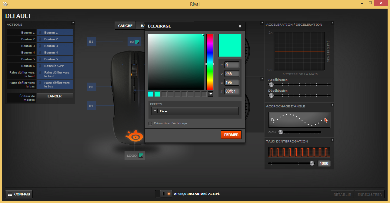 Bonne nouvelle, cette souris est compatible avec le Steelseries Engine 3. On a donc un soft qui permet de la configurer facilement et d’y enregistrer deux profils bien distincts. Cela permet de switcher entre deux types de jeux sans avoir à tous reconfigurer à chaque fois. Le switch de profils se fait depuis le bouton sur le dessus de la Steelseries Rival. Tous les boutons peuvent êtres ré-arrangés. C’est également ici que l’on pourra configurer la couleur des éclairages de la souris.