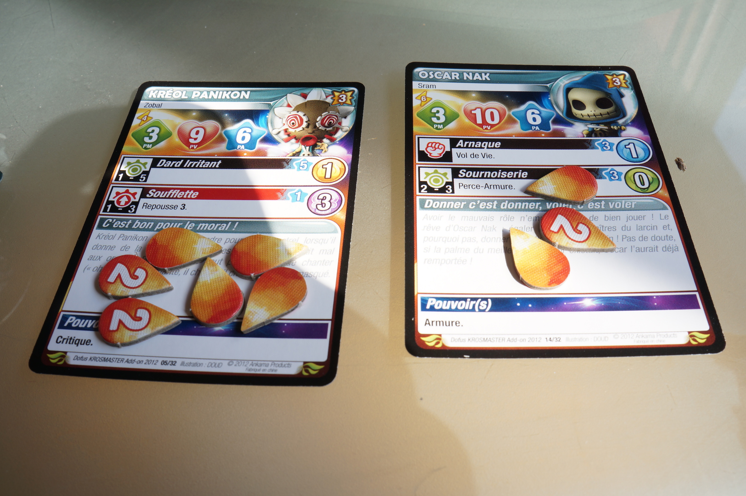 Les figurines sont plutôt jolies et dans la lignée des personnages Dofus ou Wakfu. Elles ont toutes d’une fiche de personnage associée qui reprend les caractéristiques et les différentes compétences de combat. Certaines disposent également de petits éléments tels que des bombes ou des mini serviteurs liés à leurs compétence.