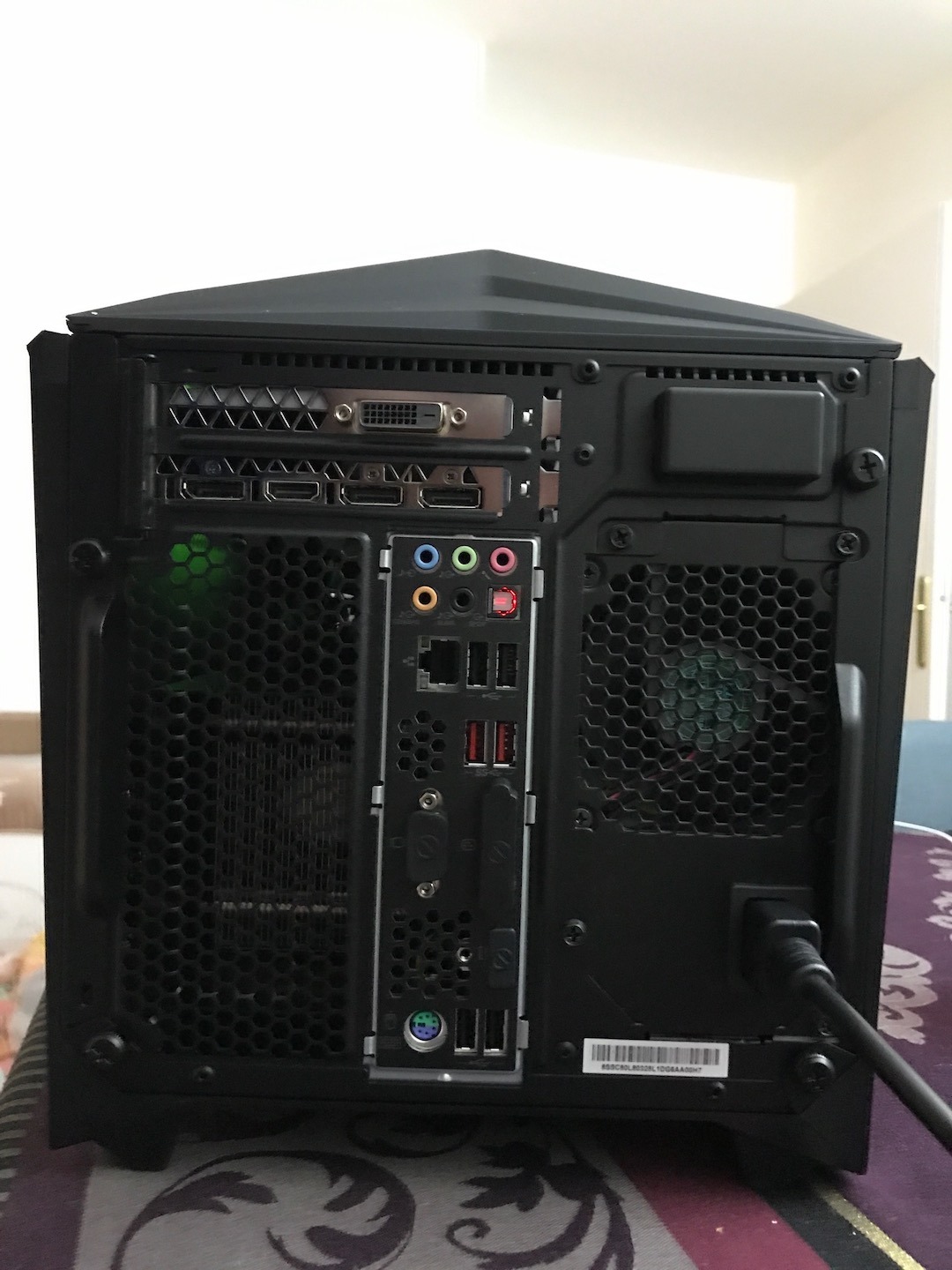 Son châssis ultra compact arbore une silhouette avant qui m’a tout de suite fait penser aux cylons de la série Battlestar Galactica. Oui, bon ok, je suis aller un peu loin, en tout cas, il ne passera pas inaperçu aux yeux de votre entourage ou lors de vos sessions LAN. De chaque coté, de larges aérations qui laissent apparaître les LEDs vertes de la carte graphique. Sur le dessus, on retrouve une poignée très pratique pour le transporter ainsi que des ailettes rouges qui rappellent celles d’une Lamborghini. Enfin et cela peut avoir son importance pour le « câble management », le bloc d’alimentation est intégré au boitier. Enfin, on retrouve des LEDs rouges sous le châssis qui illuminent le support où repose le boitier.