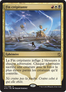 En troll à deux têtes, ses effets sont dévastateurs. Pour trois mana seulement, certes colorés, Fin crépitante inflige quatre blessures et fait sacrifier deux créatures. Et par n’importe lesquelles, celles de chaque joueur qui ont la force la plus élevée. En passant, je vous rapelle que le mot clé « sacrifier » fonctionne aussi sur les créatures indestructibles !