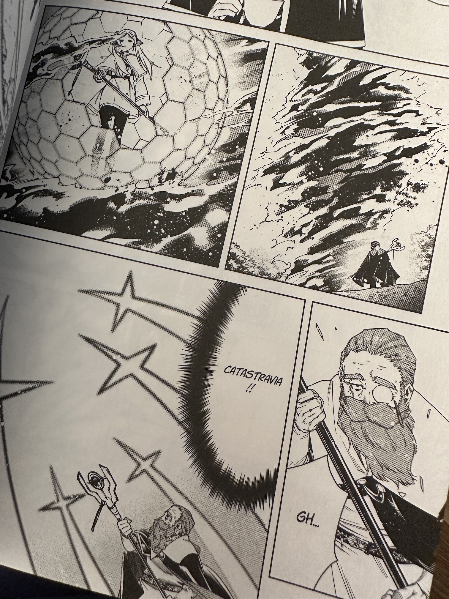 Je profite des fêtes de fin d’année pour rattraper toutes mes séries laissées en stand-by à cause d’un trop plein de boulot ces dernières semaines. Frieren faisait partie du lot avec son tome 5 qui s’annonçait déjà bouillant car il allait faire place à un examen opposant de nombreux mages. Objectif : le titre de mage de première catégorie qui permettrait à notre troupe d’accéder au Haut-Plateau du Nord et ainsi de continuer leur périple.
