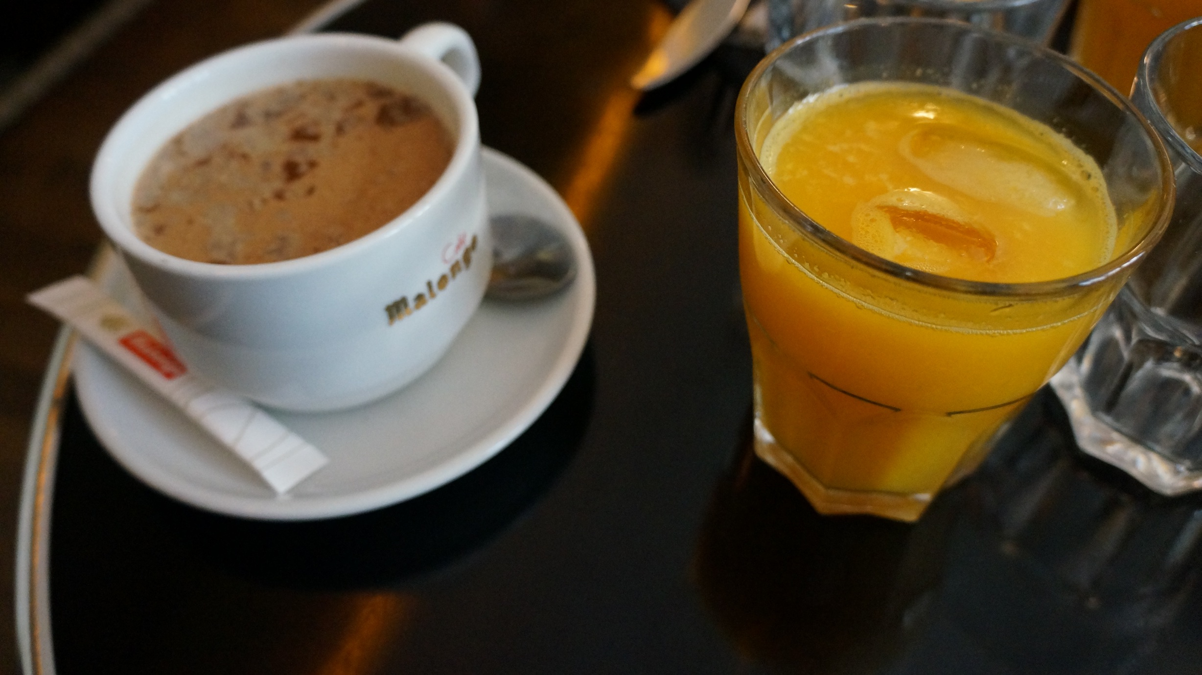 On commence avec mon combo ultime, le chocolat chaud pour débuter le brunch et son jus d’orange que je déguste tout au long du repas en gardant une bonne rasade pour faire passer le tout à la fin du repas. Rien à dire sur le chocolat chaud, très bon avec un gout de chocolat bien présent. Le cacao saupoudré sur le dessus est très appréciable. Quant au jus d’orange, il était bien frais et très bon. Dommage par contre l’ajout de glaçon pour le rendre frais, j’aurais préféré des oranges pressées bien fraiches stockées dans un frigo plutôt.
