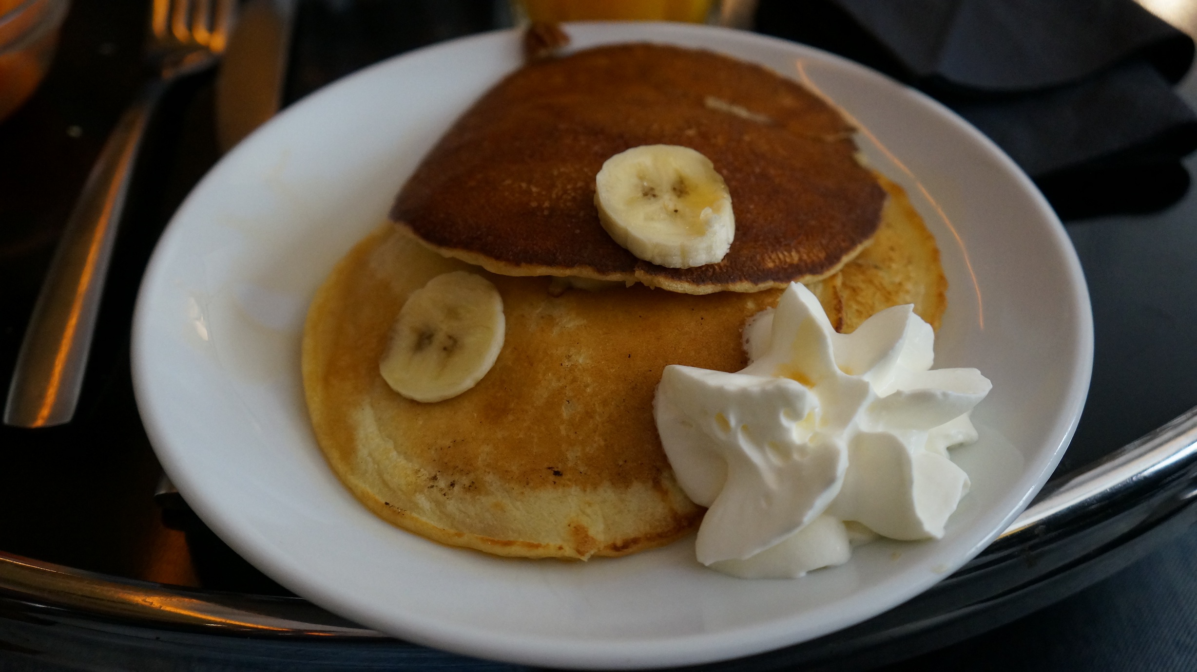 Deuxième claque, le dessert … J’ai pris des pancakes aux noix de pécan et à la banane. Pensant naïvement qu’il y aurait quelques morceaux de banane pour accompagner les pancakes, je m’était trompé sur toute la ligne. Par un ingénieux procédé, la banane et les noix de pécan étaient intégrés à la pâte des pancakes. Le tout était juste fondant, les goûts se mélangeant dans la bouche avec les noix de pécan en petits morceaux qui donnaient du croquant (mode Top Chef) lors de certaines bouchées.