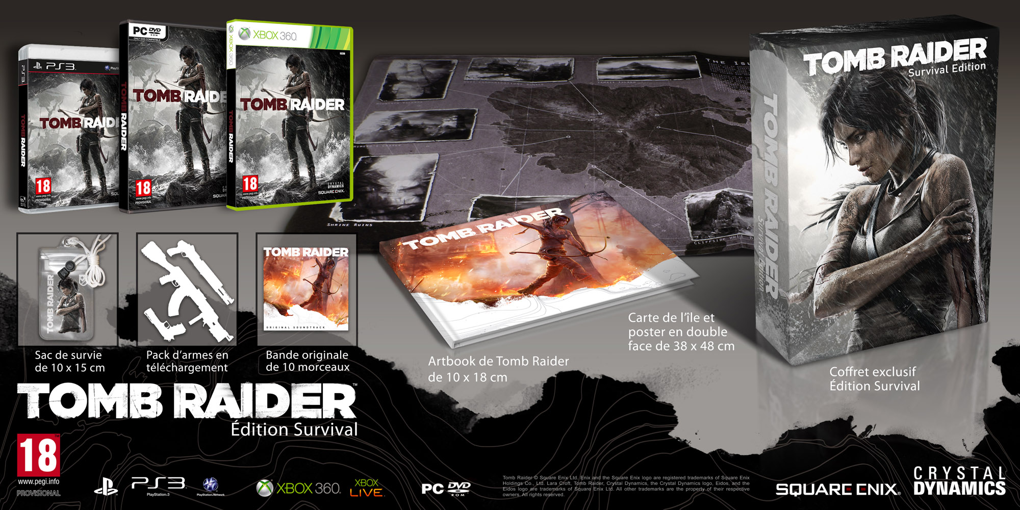 Une carte de l’île et un poster en double face : Un poster de 38cm x 48cm, illustrant d’un côté les points de repère majeurs de l’île mystérieuse de Yamatai, où Lara Croft et ses compagnons d’infortune échouent à la suite du naufrage de l’Endurance, et de l’autre des concepts fondamentaux illustrant la genèse de Lara Croft.