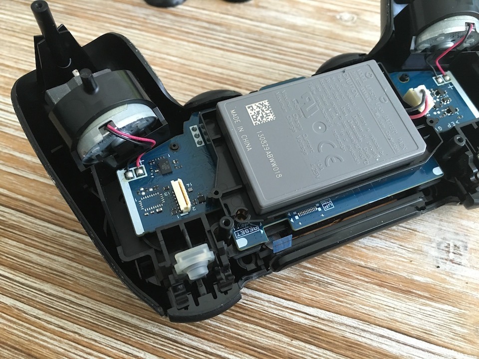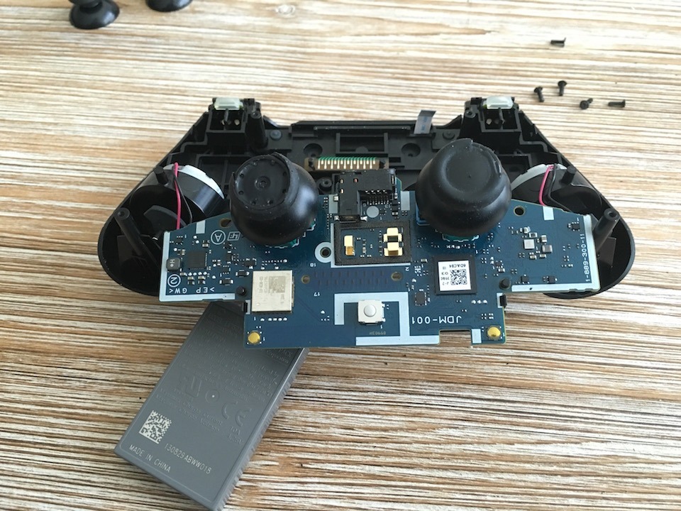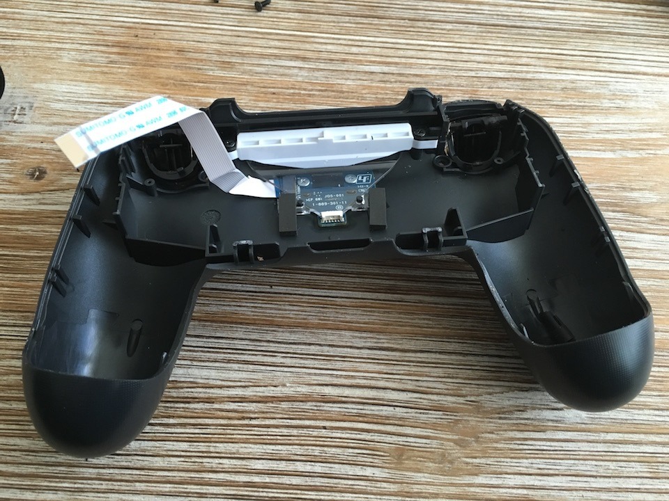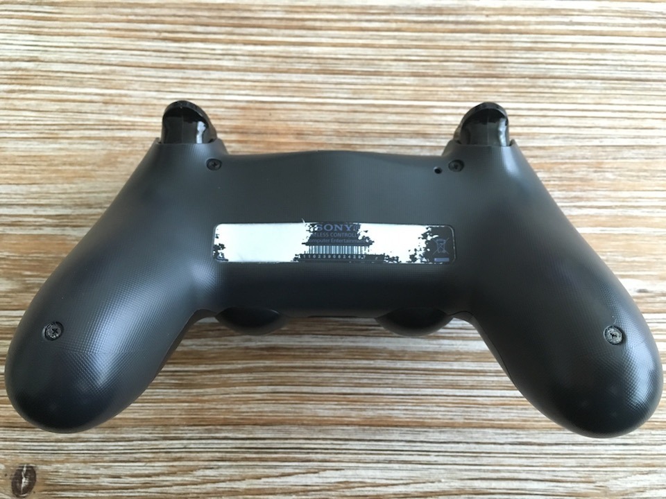On démarre en retournant la dualshock 4 et en dévissant les quatre vis qui maintiennent la coque avant et arrière. Puis en forçant légèrement pour faire sauter les clips d’attache, on sépare les deux coques. Attention à y aller doucement car une nappe relie les deux parties et il y a de petits ressorts qui risquent de sauter au niveau des boutons L2 et R2.