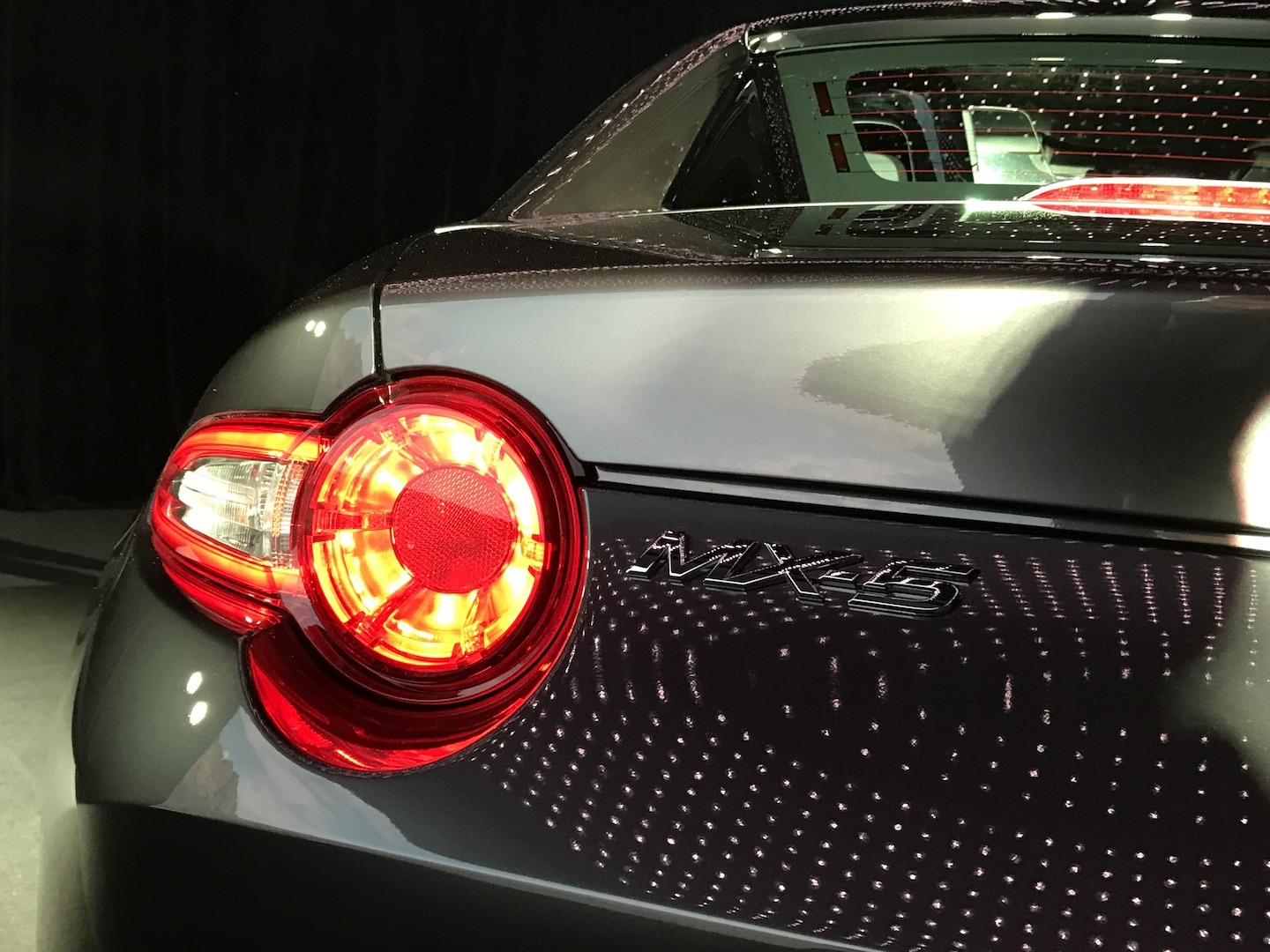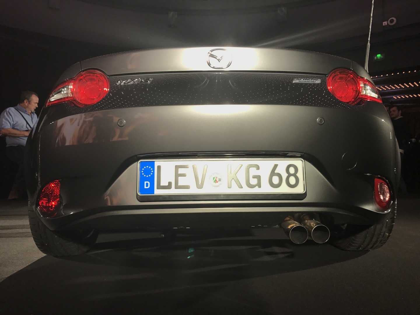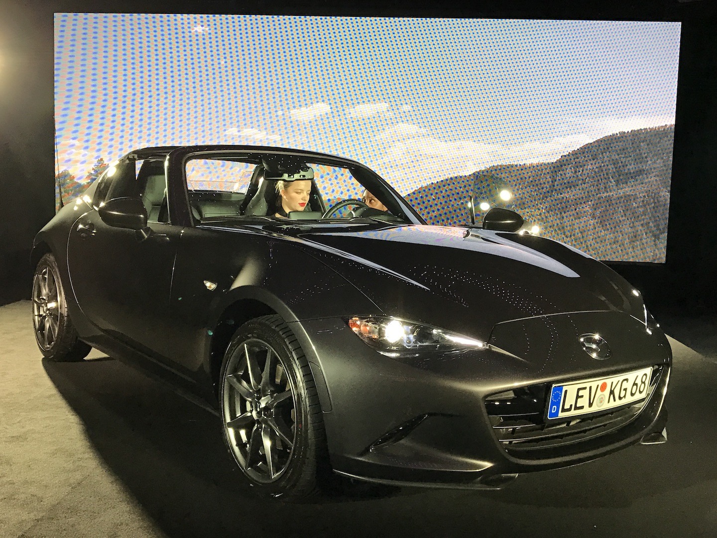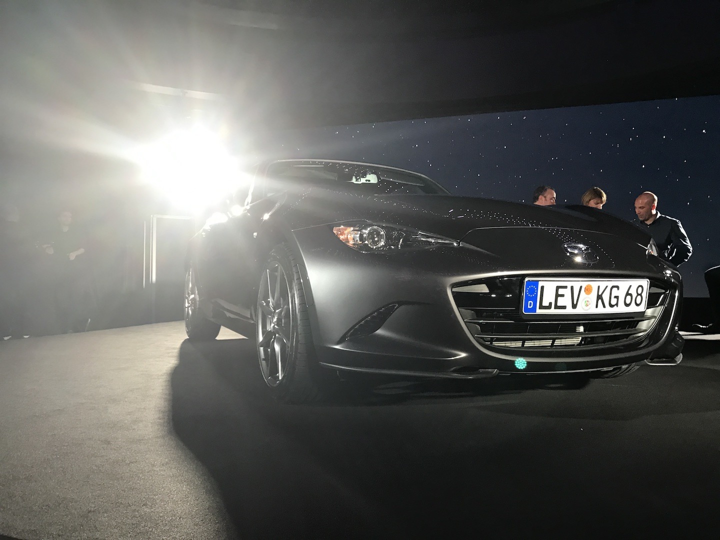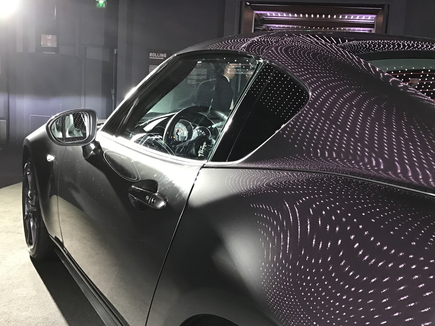Il y a quelques mois, j’ai eu l’occasion (ou l’opportunité) de découvrir en seconde partie de soirée la Mazda MX-5 RF. Venant éclaircir une soirée qui avait mal débuté, j’ai pu prendre quelques photos de ce roadster et surtout m’assoir à l’intérieur de l’habitacle rêvant alors de folles chevauchées cheveux aux vents. Malheureusement, il s’agissait d’une voiture solidement ancrée sur une plateforme ne laissant place qu’à un 360° perpétuel.
