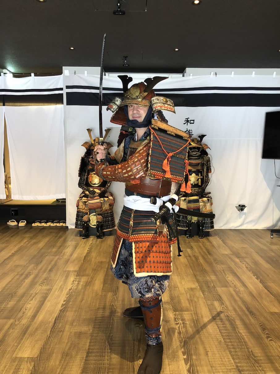 Et là c’est tout un cérémonial. Cela a pris entre 15 et 20 mn pour revêtir cette armure de Samouraï. L’agence possède une dizaine d’armure et on peut choisir celle que l’on souhaitera enfiler. On démarre par un Kimono que l’on peut choisir parmi une sélection. Puis vient le moment d’enfiler le Do (cuirasse) et le Kusazuri (jupe). Mais ça ce s’arrête pas là puis les bras sont également protégés par le Kote et les épaules par de grandes plaques, le Sode. les jambes sont protégées également par des plaques d’acier, on appele cette partie le Suneate. J’ai également tester un Nodowa qui fait office de protège gorge. Enfin on termine avec le Kabuto (casque) qui pèse à lui tout seul 5 Kg !!!