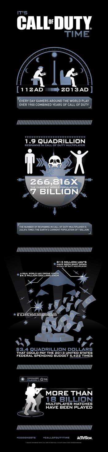 Activision nous propose, pour la sortie de Call of Duty : Ghosts, une infographie sur sa communauté. Pour rappel, Call of Duty: Ghosts est disponible depuis le 5 novembre sur Playstation 3, Xbox 360, PC et Wii U.
