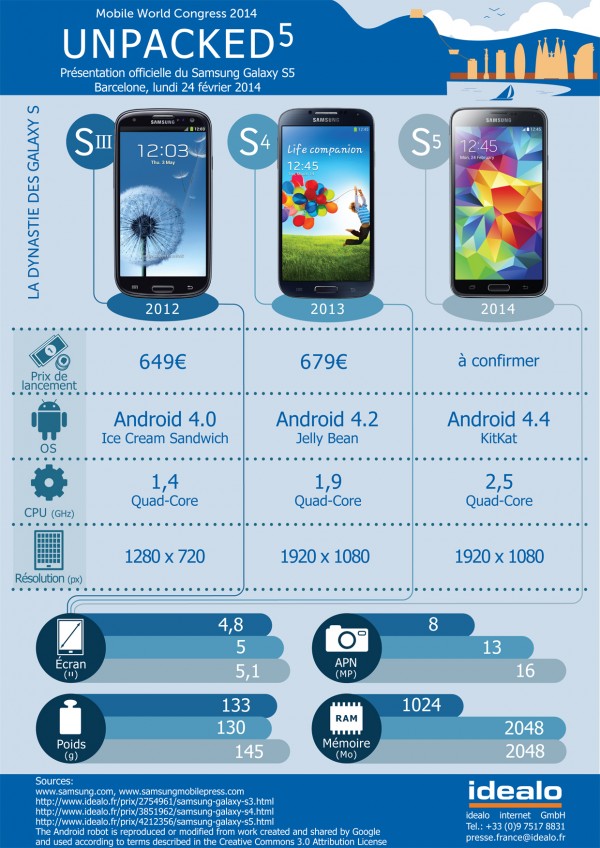 C’est notre partenaire d’un jour, Idealo.fr, qui nous propose une infographie sur la dynastie des Galaxy S de Samsung suite à la présentation au Mobile World Congress du nouveau flagship de la marque à savoir le Galaxy S5.