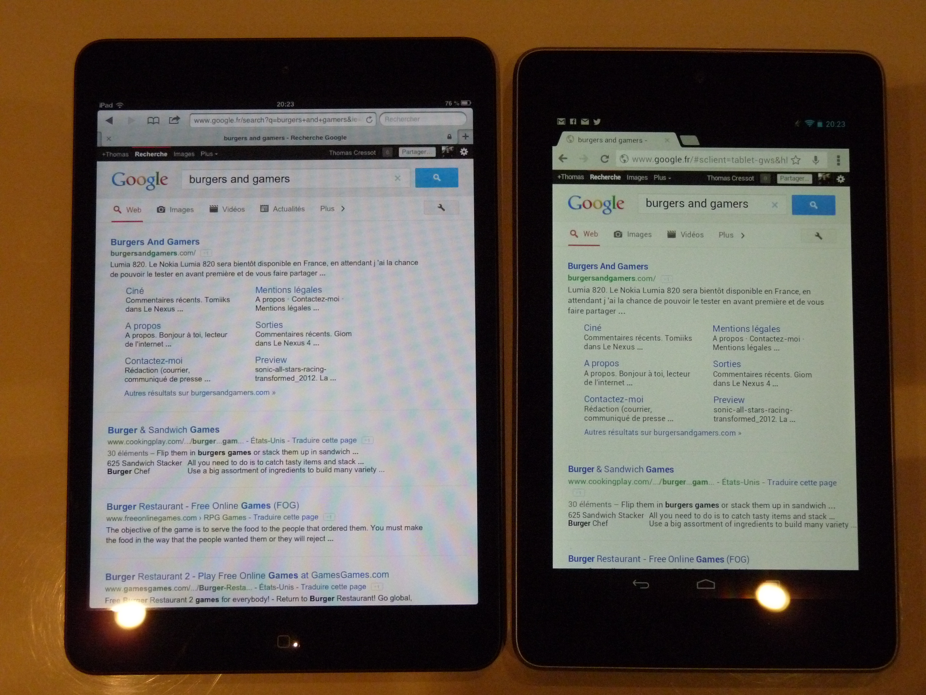 Du coup, je trouve que la navigation Web est plus confortable sur l’iPad Mini tandis que le visionnage de film ou de vidéo est à son avantage sur l’écran du Nexus 7.