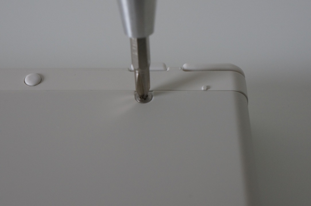 Sur la face avant, il suffit de déclipser la cover plate. Pour le faire facilement, localisez les petites encoches sur le coté et tirez dessus. Pour la face arrière, utilisez un petit tournevis cruciforme et allez-y doucement pour ne pas peter les pas de vis.