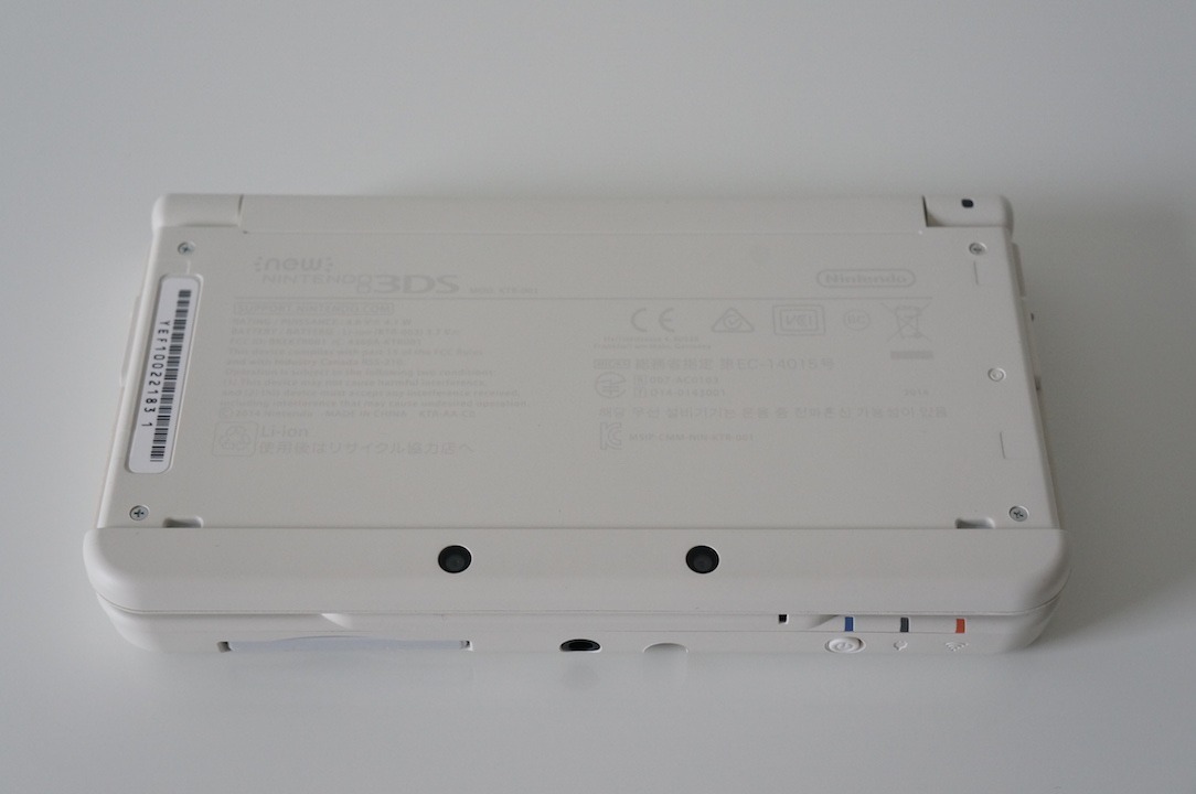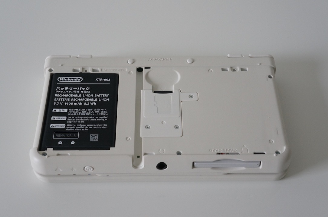 Et voilà à quoi ressemble une New 3DS toute nue. Rien de bien interessant coté face. Coté pile par contre, on y découvre la batterie amovible ainsi que l’emplacement pour la carte mémoire.