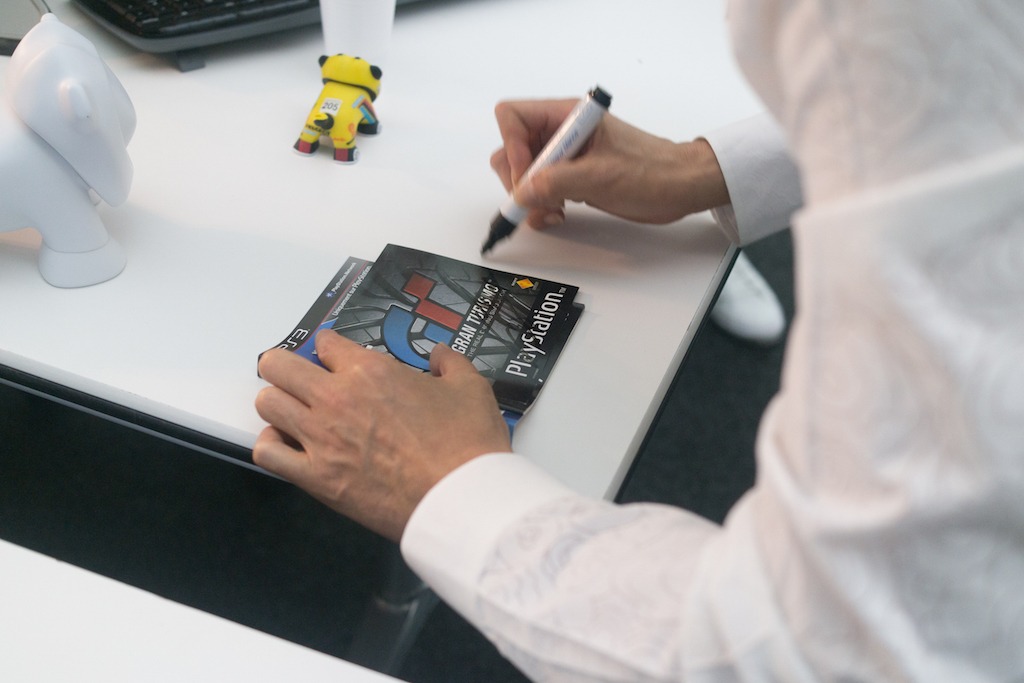 J’ai également pu, pendant ce moment privilégié, discuter avec Kazunori Yamauchi qui m’a révélé travailler de façon très intensive sur Gran Turismo 7 sur PS4 bien évidemment. Hélas nous n’avons pas réussi à en savoir plus, juste un sourire de plaisir coupable quand il a évoqué le jeu. Pour couronner cet après-midi, j’ai eu la chance de faire signer mes jeux Gran Turismo par le maître en personne. Il s’est prêté très gentiment au jeu des dédicaces et on sent qu’avant d’être un producteur de jeux vidéo c’est avant tout un passionné d’automobile.