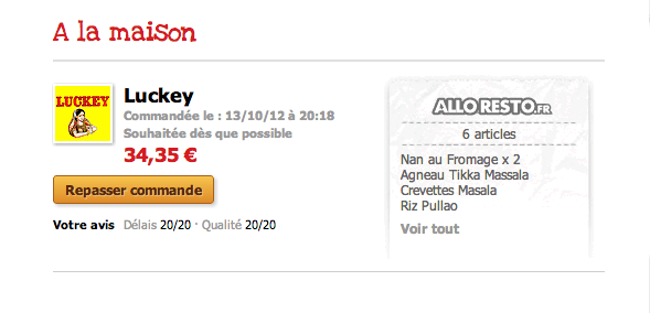 En attendant ma commande, je reçois un coup de fil et au bout de la ligne une personne d’Alloresto.fr m’indique que ma commande est en cours de préparation et si j’ai des questions à propos de celle-ci. Plutôt sympa, et ça fait très quali. Je ne sais pas si c’est uniquement pour la première commande mais j’ai été agréablement surpris. De la même façon j’ai reçu quelques jours plus tard un bon de réduction de cinq euros à valoir sur ma prochaine commande pour me remercier d’avoir utilisé leur service.