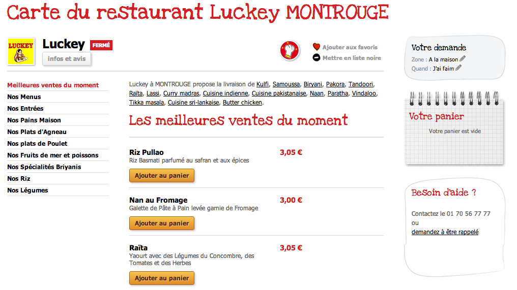 Une fois le restaurant choisi, il s’agit maintenant de choisir ses plats. Très simple également, les spécialités de chaque enseigne sont référencées et triées et il suffit d’un clic pour les ajouter à son panier. Ensuite très simplement on passe par la case « Paiement » et la commande est lancée. Une fois le paiement validé, on reçoit un mail confirmant la prise en compte de la commande avec l’heure de livraison validée par le restaurant lui-même.