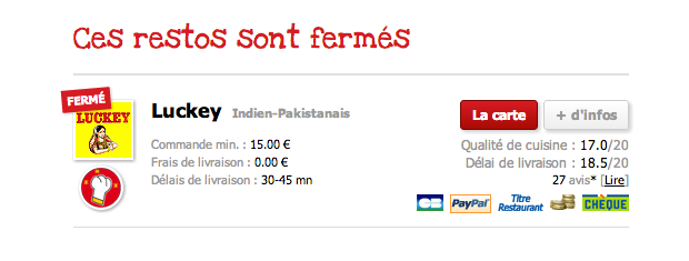 Je ne m’étais jamais fais livrer de repas indiens, une bonne raison de tenter d’autant que j’aime plutôt bien leurs plats. Chaque restaurant dispose d’une fiche présentant toutes les infos nécessaires pour bien choisir en connaissance de cause. Délai de livraison, type de paiement possible, minimum de commande mais ce n’est pas tout, deux notes importantes sont égalements indiquées :