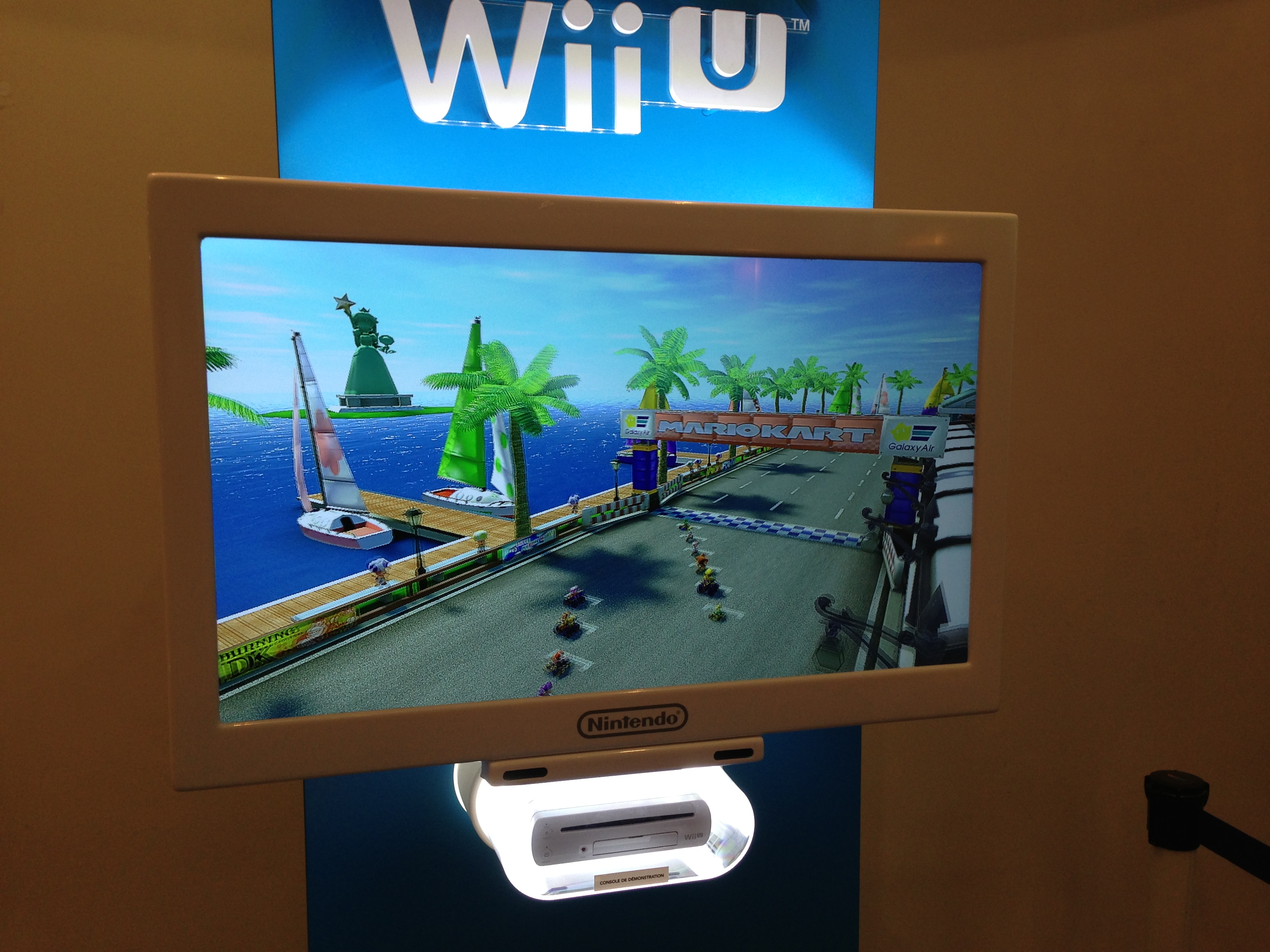 Mon coup de coeur de cet après-midi. Je commence directement par ma petite déception. Comme sur tout les Mario Kart, je trouve les véhicules un poil lents. Par exemple, je préfère le dynamisme se Sonic All-Stars Racing Transformed. Mais on m’a dit que la démo se faisait sur les véhicules 100cc. Du coup on peut espérer un jeu plus rapide avec la catégorie 150cc dans la version finale. Hormis ce point, j’ai trouvé le jeu très réussi. Il est très fluide avec la promesse d’un 60 images par seconde constant. J’ai pu rouler sur trois circuits et il faut dire que ceux-ci sont de toute beautés. Nintendo montre encore une fois que ses univers colorés prennent toutes leurs essences en HD. On en prend pleins les yeux, les karts se transforment au grès des portions de routes en deltaplane ou en véhicules aquatiques. Mais on peut rouler désormais sur certaines parois, murs ou même des portions de circuit à l’envers. Et oui, les karts disposent d’un module anti-gravité pour ça et on se retrouve parfois la tête à l’envers mettant encore plus de fun lors des courses. Petites nouveauté mais maxi fun.