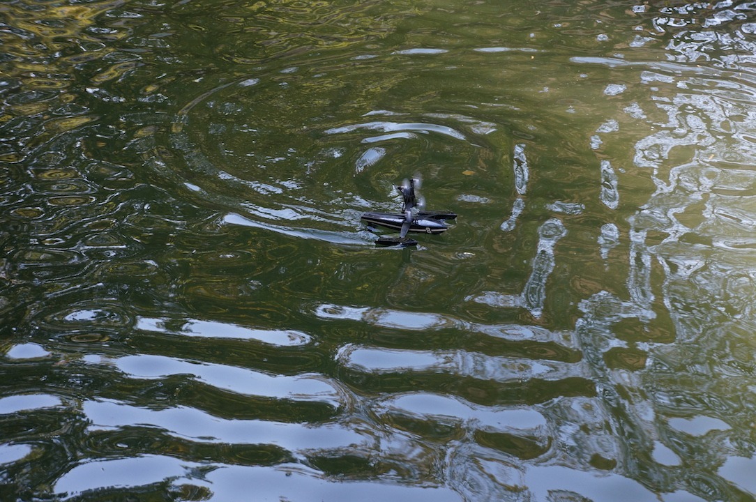 Il y a deux modes de déplacements. Le premier lorsque la partie mobile est à plat permet d’orienter le drone vers la direction souhaitée en le faisant tourner sur lui même. Une fois que l’on relève la partie mobile, c’est parti pour des accélérations folles. Le drone s’élève au dessus de l’eau et semble littéralement flotter au dessus. Enfin ça c’est quand il ne s’embourbe pas dans les algues et autres déchets parsemant le canal. Dans les conditions optimales il pourra atteindre les 10 Km/h.