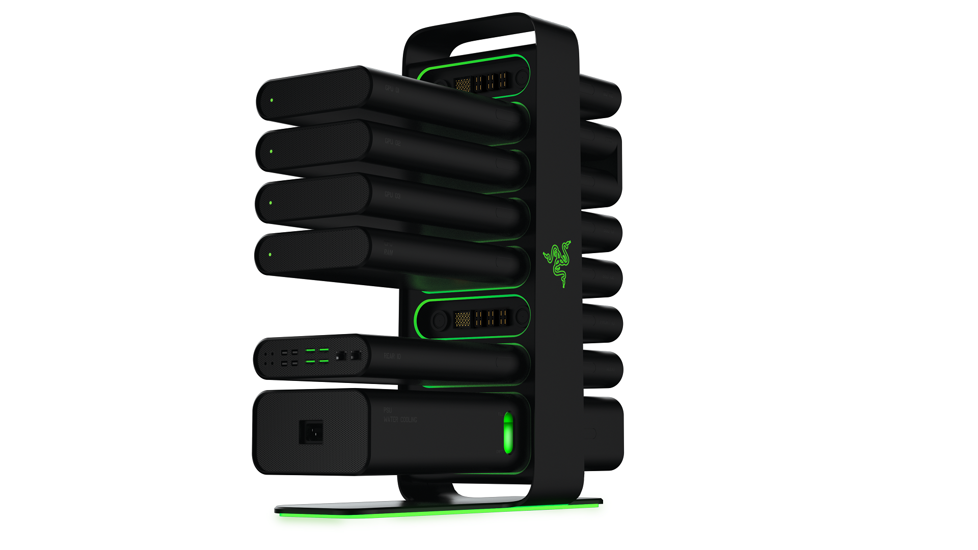Or ce potentiel reste hélas loin de la portée de la plupart des gens. C’est compliqué ! Où sont les drivers ? Ce processeur est-il compatible avec cette carte mère ? Qu’est ce que les timing du RAM ? etc … Razer propose donc une plateforme modulaire. Par modulaire, on entend qu’il sera possible de brancher, débrancher, ajouter, retirer des éléments sans crainte de comptabilité ou de soucis techniques. De plus ce système propose un refroidissement liquide (adieu le bruit des ventilos) et la disparition des câbles qui peuvent vite devenir un puzzle insoluble même si on a fait pas mal de progrès ces dernières années.