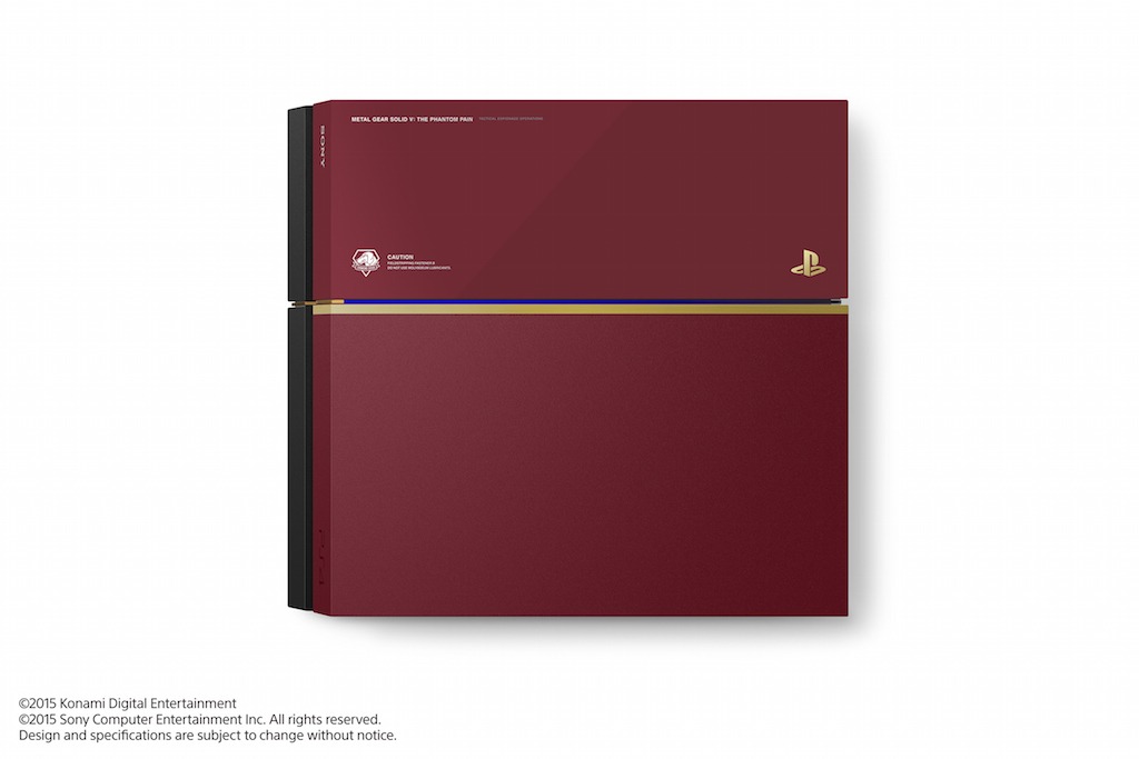 La console PS4 incluse dans ce pack bénéficie d’un coloris d’un rouge profond sublimé d’éléments dorés, inspirés du bras bionique de Snake dans le jeu. La manette sans fil DUALSHOCK 4 sera elle parée d’un coloris gris métallique, rappelant l’arme de poing équipant Snake. Chacun de ces deux éléments sera également frappée de l’emblème des Diamond Dogs, l’armée privée menée par Snake. Le pack inclus également un thème spécial METAL GEAR SOLID V: THE PHANTOM PAIN pour PS4.