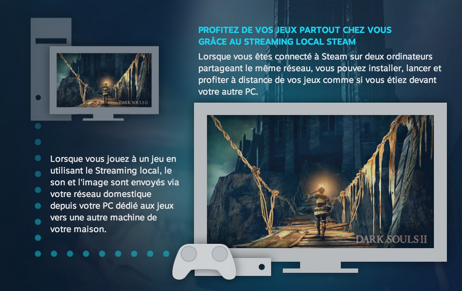 Bon ça c’était pour envoyer du contenu sur le web. C’est bien, mais le streaming a d’autres applications comme par exemple distribuer du contenu (vidéo, musique, photo) chez soit d’un device à un autre. Cela permet de concentrer tout son contenu à un endroit et de le diffuser dans les autres pièces sans aucun branchement supplémentaire. On connaissait l’apple TV, Sonos et Chromcast, le dernier gadget de google qui permet de streamer du contenu depuis son navigateur web vers sa télévision en un geste (et encore plus avec des applis tierces). C’est au tour de Steam de rentrer sur le marché du streaming local.