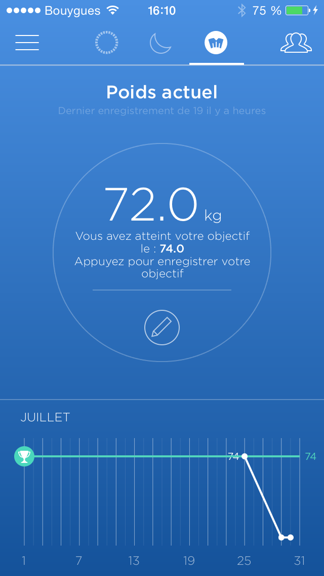 Le troisième onglet fait un focus sur notre poids. Le Misfit Shine ne servant pas à mesurer son poids, ici il m’a fallu remplir à la main chaque jour cette donnée.