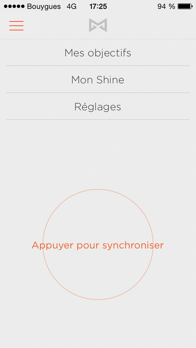 Le menu permet de synchroniser manuellement le shine, de régler son objectif journalier et d’accéder aux réglages de l’application (infos persos, choix des unités de mesures, assistances hors ligne, …).