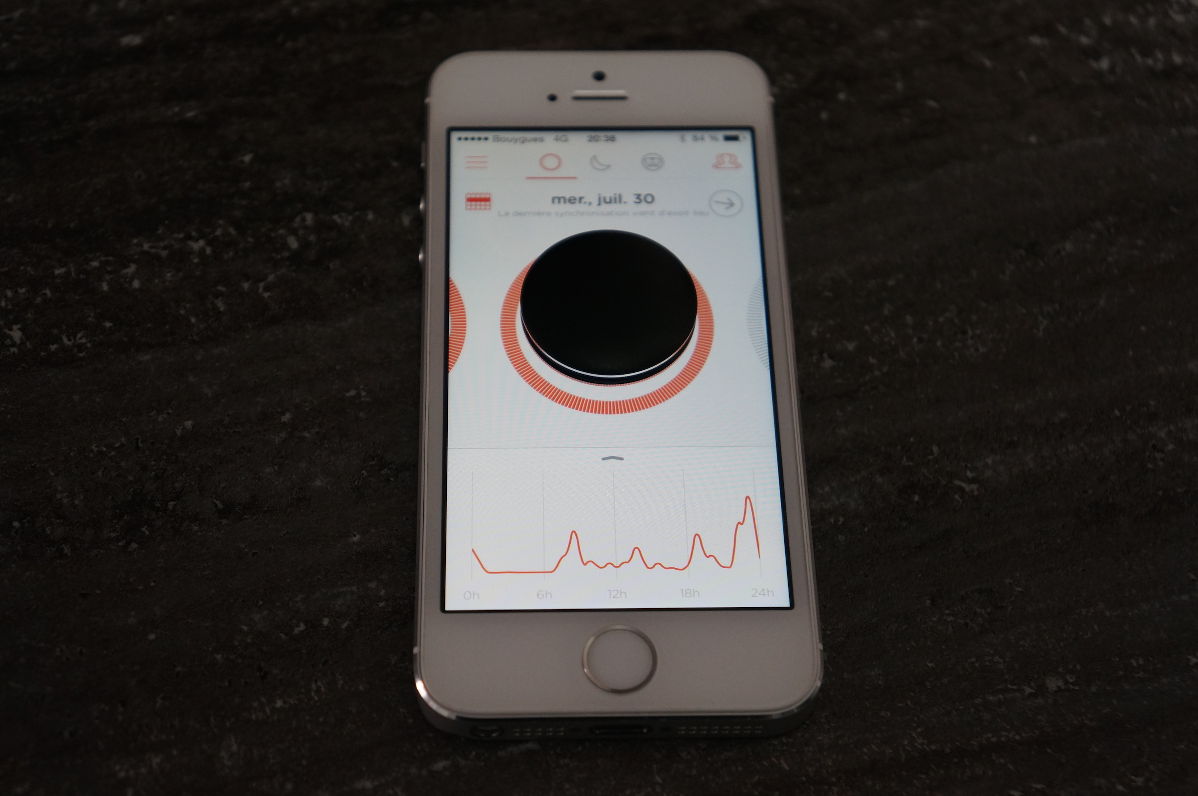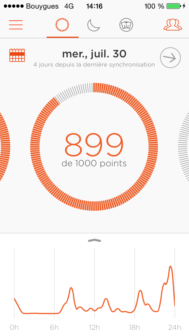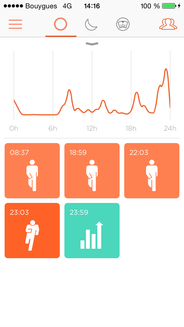 Le premier onglet renseigne les données en journée. On y retrouve son objectif journalier avec une courbe qui donne un historique de la journée. On a également un focus lors de période plus intense sous forme de badge.