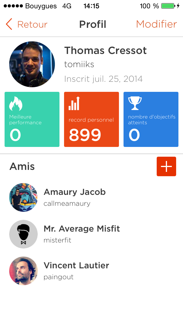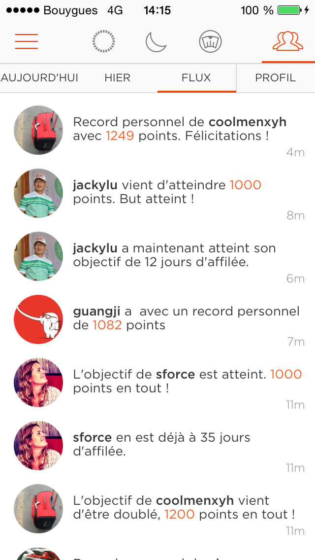 Comme à l’accoutumée sur ce genre de produit, la gamification joue un rôle prépondérant. A la fois pour ce motiver soi même mais aussi pour créer une sorte d’émulation au sein de la communauté utilisant le Misfit Shine. On peut ainsi se comparer à ses amis mais il y a également un onglet flux qui permet de voir les résultats d’autres utilisateurs que l’on ne connait pas. Enfin, il y a une page récapitulative de ses propres performances qui permettra de faire gonfler votre égo. Si si je vous assure que ça marche.
