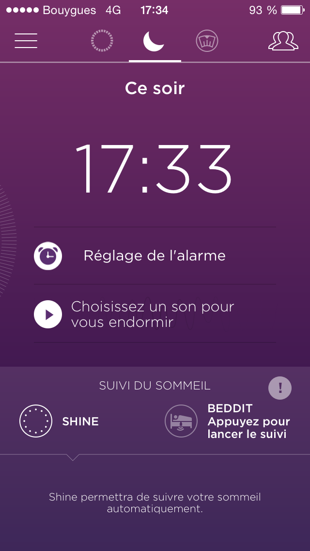 L’onglet nuit comme son nom l’indique se propose de restituer visuellement notre sommeil avec les plages horaires de notre sommeil léger et réparateur. Pour rappel, on peut indiquer au Misfit Shine le début du phase de sommeil en tapant trois fois dessus. Via l’appli on peut le paramétrer pour qu’il nous réveille pendant une phase de sommeil léger. Du coup, on programme une heure de base avec une plage variable dans laquelle le device choisira le meilleur moment pour nous réveiller.