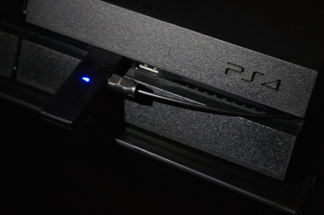 Si vous vous rappelez de mon test du Turtle beach PX4, la configuration du casque avec la PS4 était un poil compliqué. Cette fois-ci tout est plus simple et plus rapide. Déjà fini les boitiers à connecter à la PS4 pour établir la connexion avec le casque. C’est dorénavant une clé USB que l’on connecte à la PS4. Cette clé doit être également reliée à la sortie optique de la PS4 via une encoche sur le coté comme vous pouvez le voir sur la photo. Si c’est moins esthétique, cela prend moins de place c’est indéniable. A noter que le câble optique est fourni, appréciable !