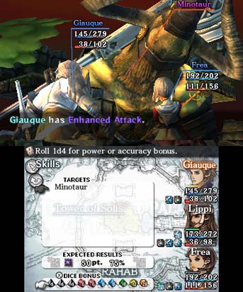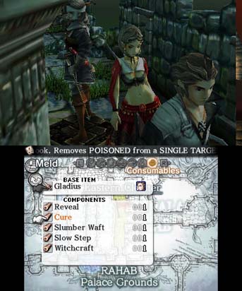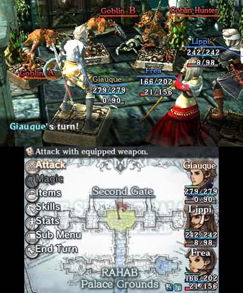 Au niveau graphique, on sent bien l’empreinte de Vagrant Story. Normal, car Yasumi Matsuno est notamment aux manettes du design. Et ce n’est pas pour me déplaire tant que le chara-design de Vagrant story était réussi. Comme la plupart des plans sont fixes, la 3D marche plutôt bien. Les personnages sont représentés comme des figurines sur un tapis de jeu avec leur socle rendant le tout plutôt original. On reste néanmoins sur 3DS et du coup les graphismes d’une manière générale sont plutôt « aliasés ».