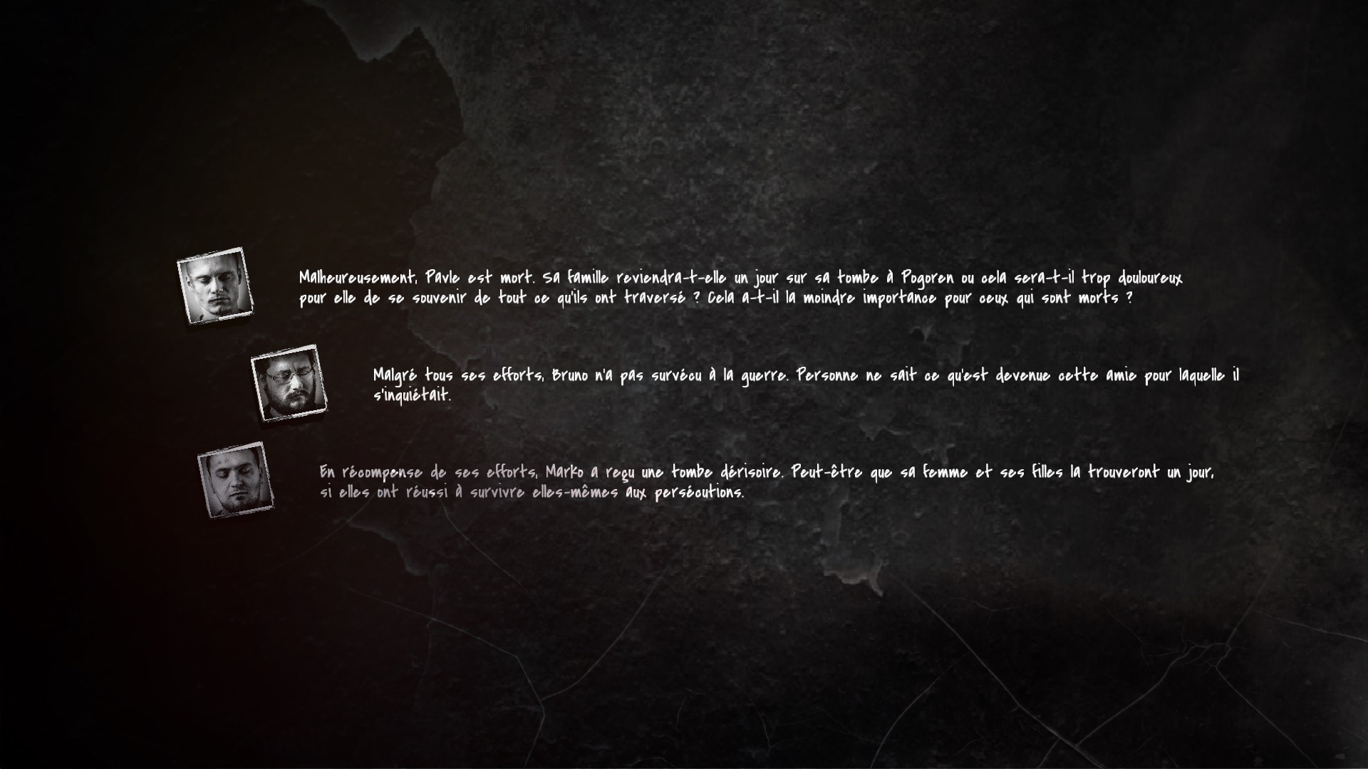 Nos habitants ont souvent le moral au plus bas et cela se ressent également dans la direction artistique du soft. Les teintes sont ternes, grisâtres d’une tristesse que n’égale que le son de la guerre qui se fait entendre tout autour de la maison qui nous sert de refuge. Non vraiment, j’ai souffert (toutes proportions gardées hein, ça reste un jeu vidéo) autant que ces innocents qui tentent de se débrouiller dans le merdier dans lequel ils baignent quotidiennement.