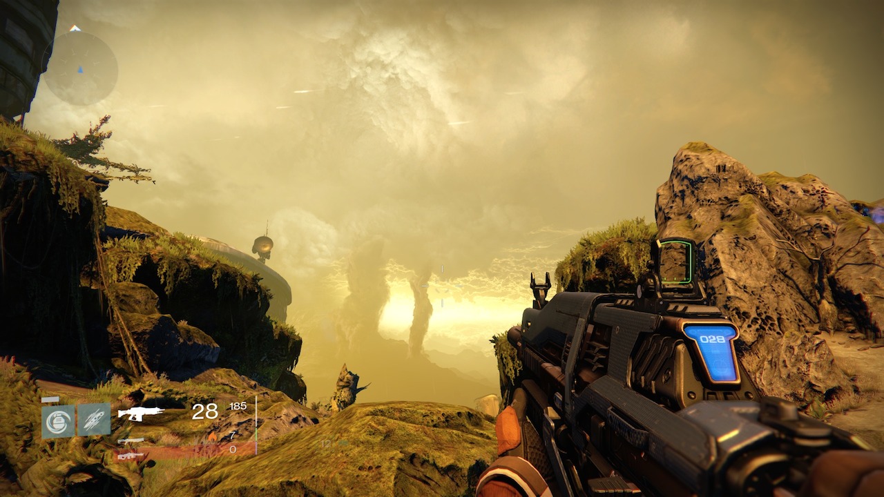Destiny, c’est avant tout Bungie, un studio qui a fait ses preuves dans la SF avec la série Halo. Une fois encore, on est projeté dans un monde où la direction artistique tout en maîtrise nous en met plein la vue. Esprit tutélaire, voyages spatiaux, machines destructrices, humanité au bord de l’extinction, tous les éléments d’une bonne série ou d’un film de science-fiction sont réunis. Dans Destiny, on incarne un gardien qui doit protéger le voyageur et l’humanité. Le voyageur est un énorme artefact endormi qui a offert de nombreuses connaissances aux humains dont celles qui leur a permis de voyager dans l’espace. Symbole d’une lumière qui vacille, le voyageur est sous la menace des ténèbres incarnée par les déchus. Une race d’extraterrestre qui vont de monde en monde, annihilant toutes vies non soumises sur leur passage. Bref, un postulat on ne peut plus classique en science-fiction mais qui permet de poser les bases d’une aventure qui va se complexifier par la suite.