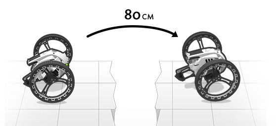 Il est plutôt tout terrain et se conduit quasiment comme une voiture téléguidée. En ligne droite il peut atteindre une vitesse de 7 Km/h. Là où ça devient rigolo c’est qu’il peut bondir de deux façons pour franchir tous types d’obstacles : soit en hauteur soit en longueur.