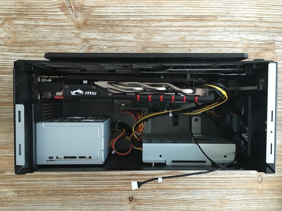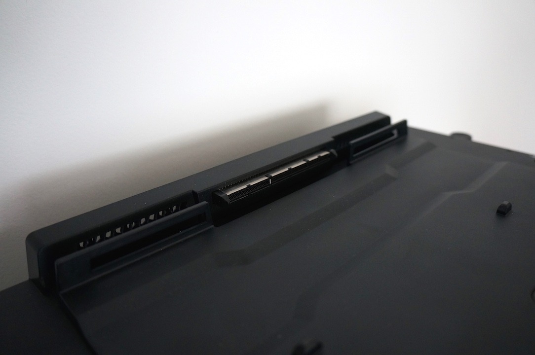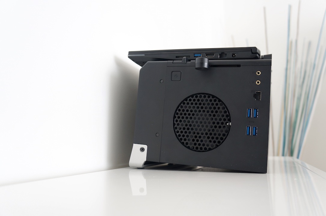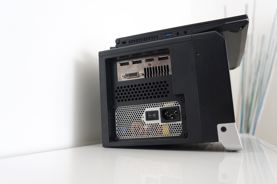 De l’autre un gaming dock qui peut accueillir n’importe quelle carte graphique (pas de limite de conso Watt). Ce dernier s’ouvre facilement et le changement de carte graphique est très simple. Même une GTX Titan Z pourra y trouver place. On peut également y ajouter un disque dur pour y stocker… ses jeux par exemple. A noter qu’il n’est pas possible de jouer sur l’écran du PC 13″ en utilisant en même temps le Gaming Dock. En effet ce dernier ne démarre que si l’écran du PC est fermé. Il faudra donc absolument un écran externe, un clavier et une souris pour en profiter.