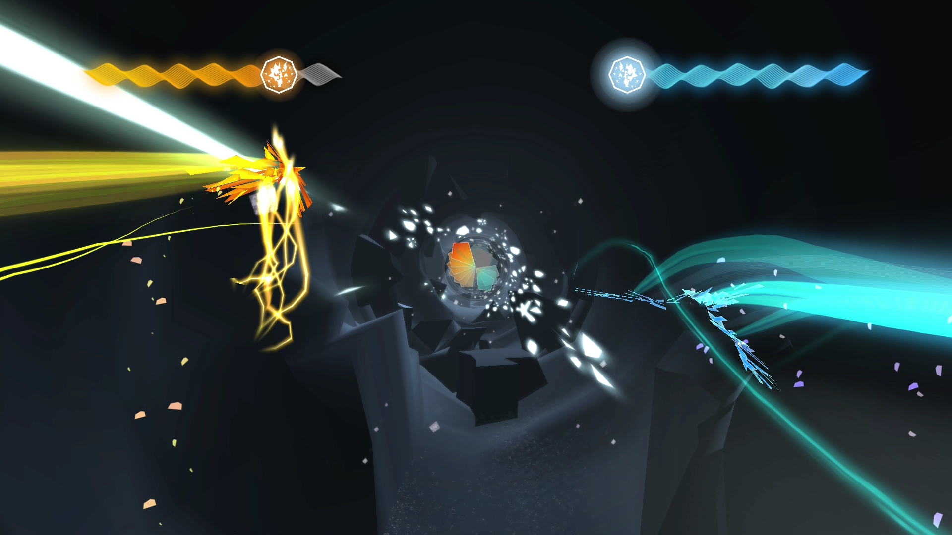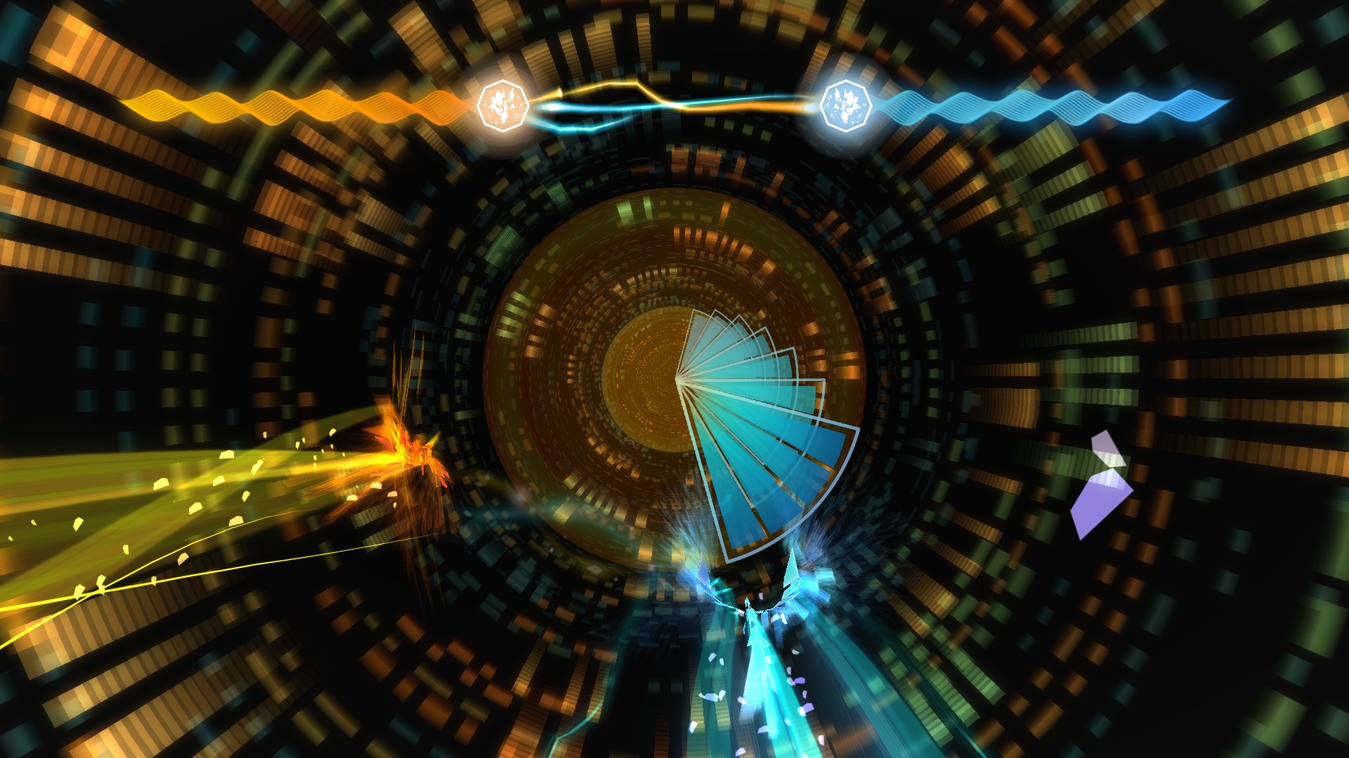 Le jeu profite du moteur de jeu Unity qui est également disponible sur PC et PS Vita. Le jeu reste joli malgré son coté minimaliste. Les couleurs sont chatoyantes et les effets dans les tunnels font penser à des démos de la scène PC. Cependant, il arrive que le framerate titube et l’image se bloque une seconde. Inadmissible pour un jeu qui finalement ne puise que très peu dans les ressources de la PS4. Les musiques sont plutôt sympa et rythment bien les parties tout en s’accordant au différentes phases de chaque partie. Elles participent activement à l’expérience que représente Entwined.