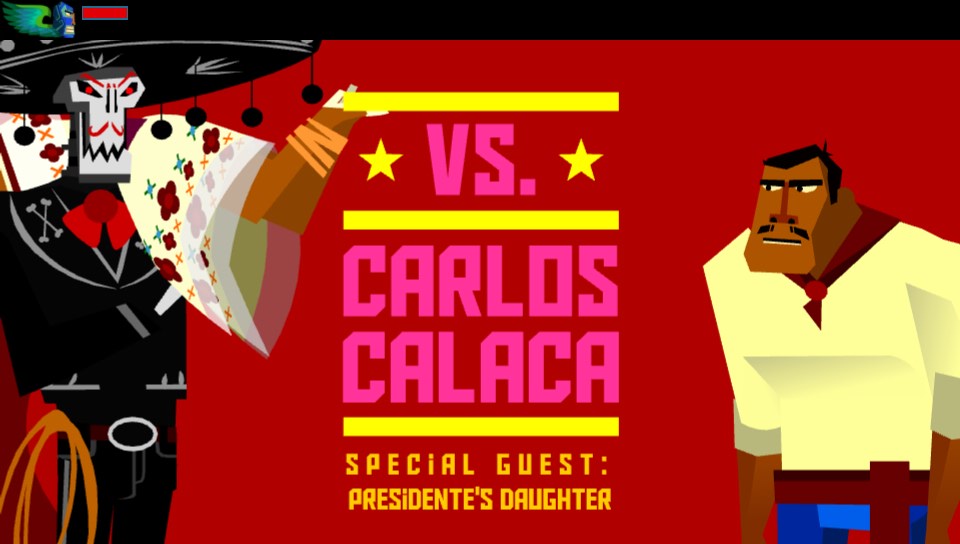 Dans Guacamelee, l’histoire sous son air très classique prendra rapidement un tournant farfelu. On y incarne un homme qui voit son village dévasté et l’élue de son coeur kidnappée. L’auteur de ce méfait ? Un certain Calaca dont on découvrira les desseins et la raison de son comportement bien plus tard. En voulant s’interposer, notre héros se fait tuer … Enfin pas vraiment car sa destinée est toute autre. En enfilant le masque sacré des luchador, une nouvelle force va s’emparer de lui. Elle va lui permettre de naviguer entre le monde des vivants et des morts. S’ensuivra une aventure loufoque où des personnages haut en couleurs se succéderont. On notera une femme névrosée délaissée par le méchant du jeu, un sage qui se transforme en chèvre pour passer le temps, un pistolero à la tête de feu qui carbure à la Tequila ou encore un coq professeur de catch.