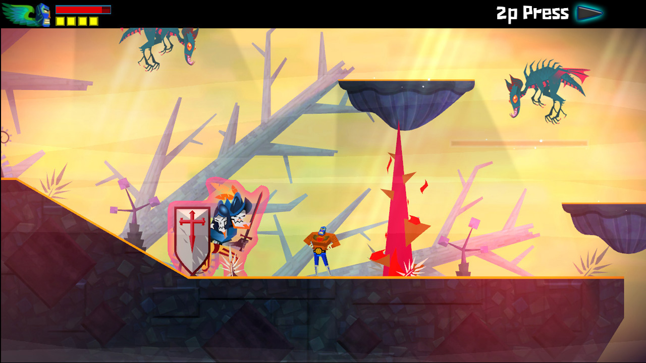 Le gameplay mettra vos nerfs à rude épreuve par moment car Guacamelee est avant tout un jeu de plateforme où le timing est primordial. Que ce soit pour se débarrasser de ses ennemis ou pour progresser aux travers des différents tableaux qui mèneront notre Luchador au repère de Calaca, il faudra jouer de la manette avec dextérité. Jamais frustrante, la difficulté du soft m’a quand même fait lâcher quelques noms d’oiseaux parfois. Aux nombres de 4, les pouvoirs offensifs spéciaux (uppercut, coup de boule, écrasement, super coup de poing) ont tous une couleur associée qui se manifeste par une légère trainée quand le coup est donné. Ceci est important car certains ennemis ont un bouclier qui ne peut être défait pendant un temps donné que si le coup correspondant a fait mouche. Cela rajoute une touche technique aux affrontements et rends les combats contre les boss assez retords.