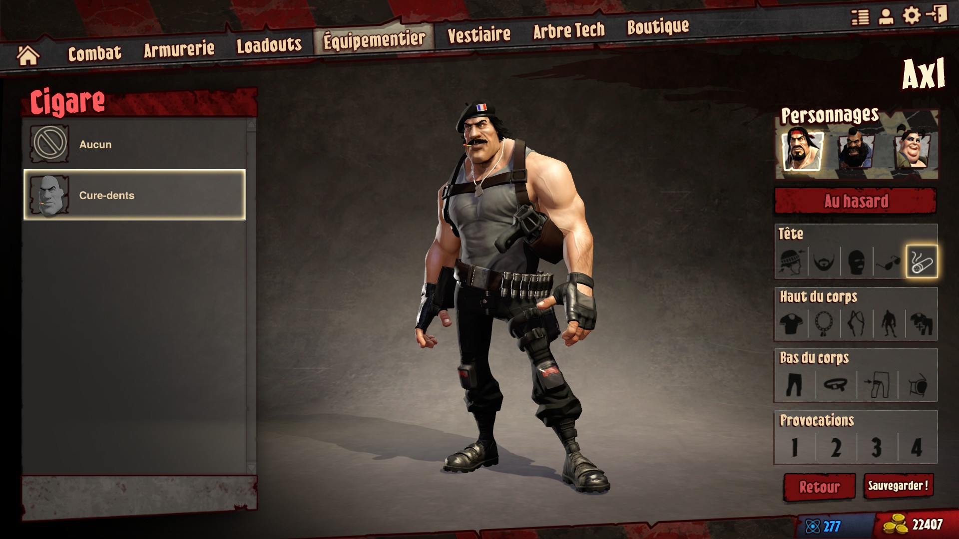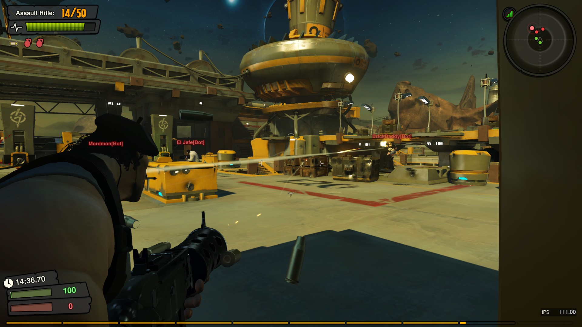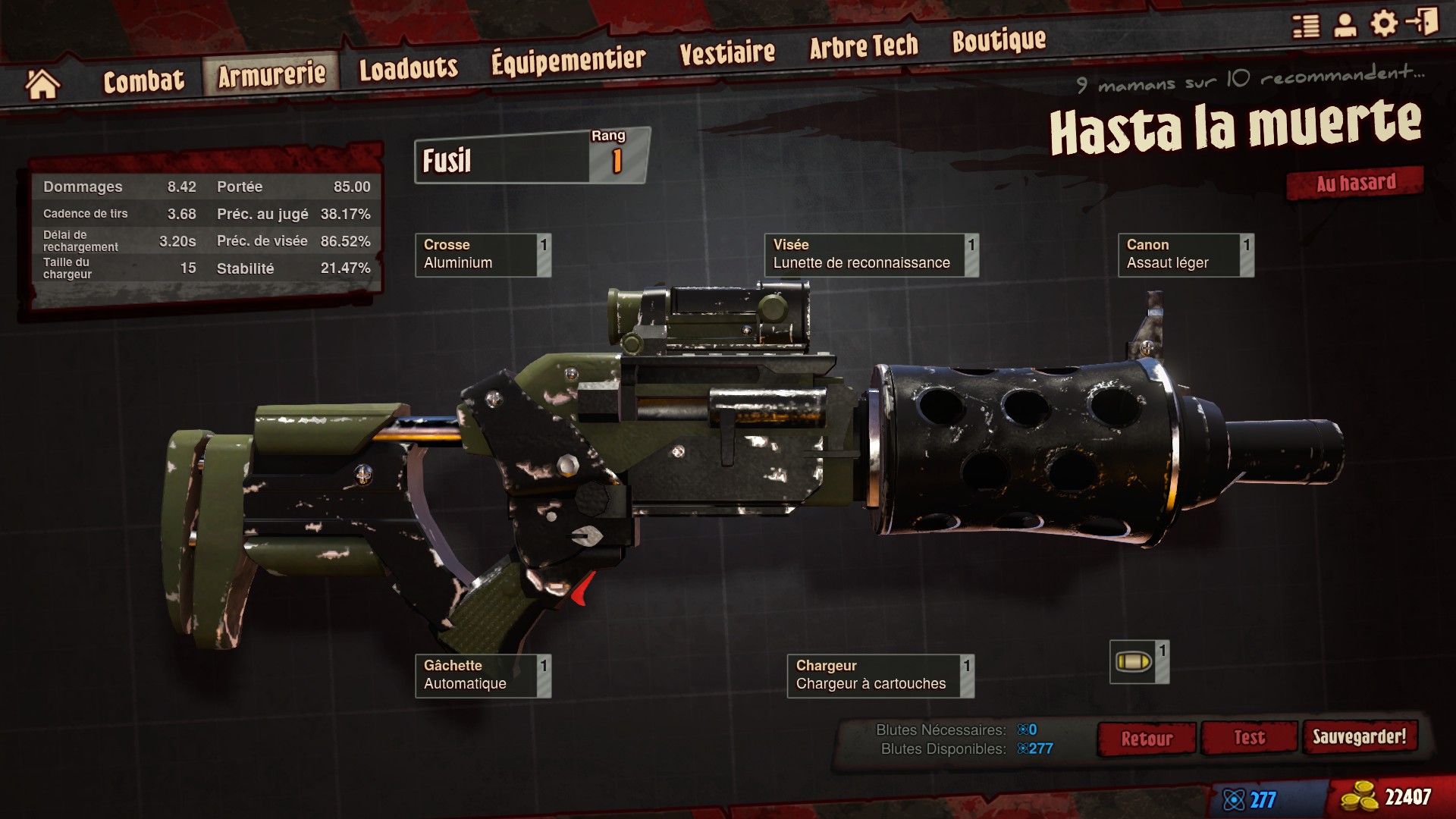 Mais là où Loadout tire son épingle du jeu, c’est dans les possibilités de customisation de son avatar. Tout d’abord au niveau de son personnage, on a le choix entre trois mercenaires que l’on pourra ensuite habiller et accessoiriser à sa convenance. Coté gameplay, c’est la customisation de son arme qui est mise en avant. Munitions, tir principal, tir secondaire, cadence de tir, rayon régénérant, laser, bazooka, autant de customisations que de styles de jeu possibles. En effet, on peut réellement adapter son personnage à sa manière de jouer et ça c’est top. Toutes ces customisations sont possibles en dépensant de la monnaie glanée au cours des différentes parties. Ci-dessous, Hasta la muerte, mon arme de prédilection pendant mes premières heures de jeux.