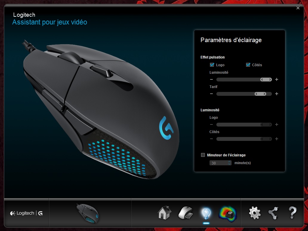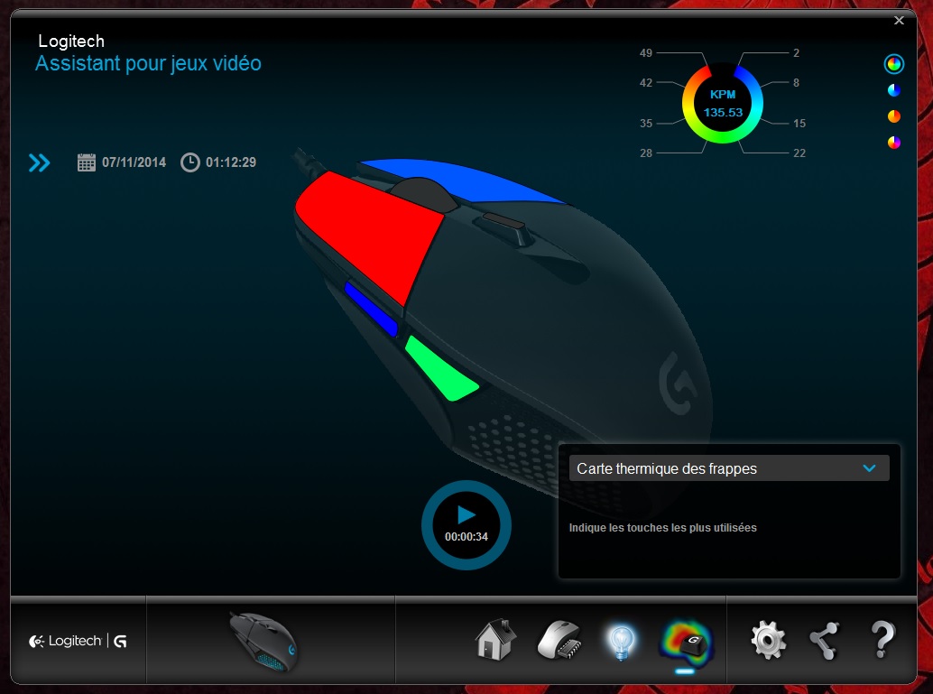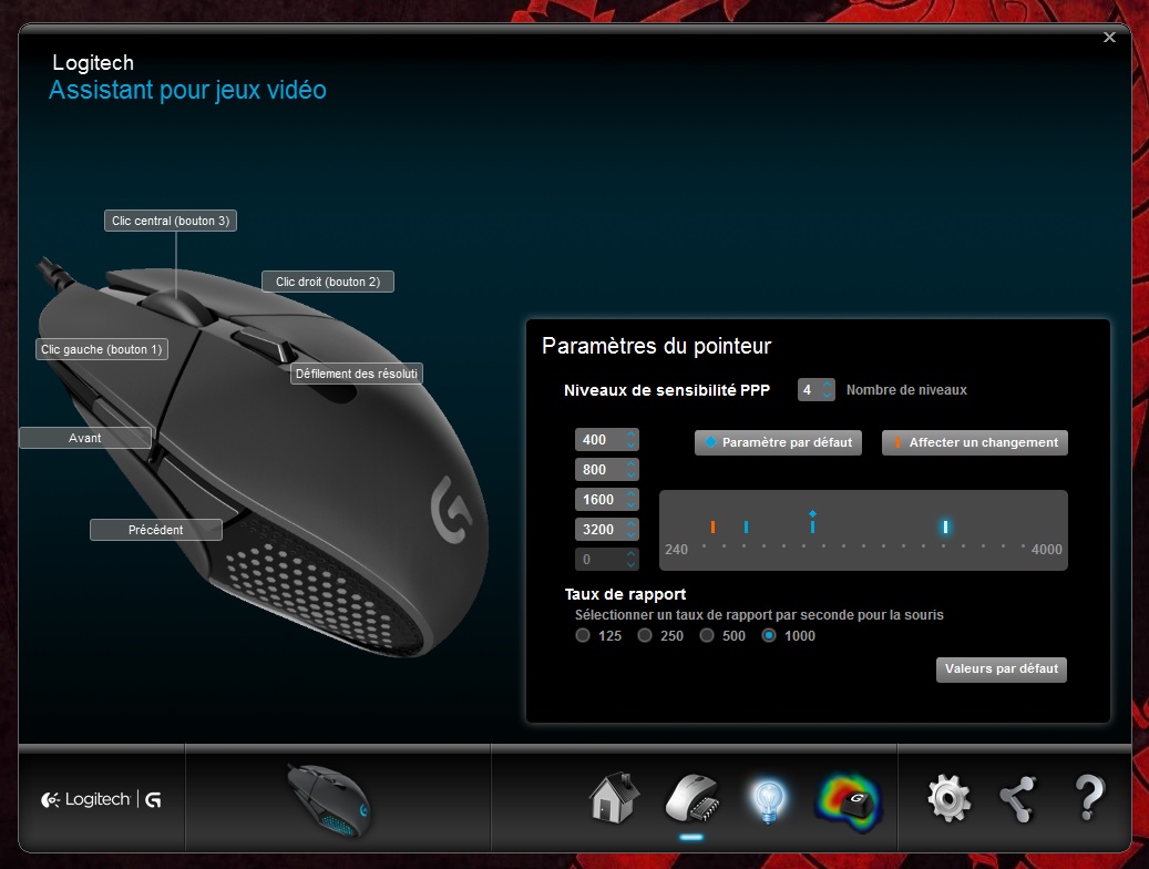 La G302 est bien sûr compatible avec le logiciel Gaming de Logitech. Celui-ci permettra de paramétrer sa souris que ce soit pour le rétro-éclairage ou pour la configuration des différents boutons. A l’instar de Razer, Logitech offre le moyen de suivre l’utilisation de sa souris avec des données statistiques.