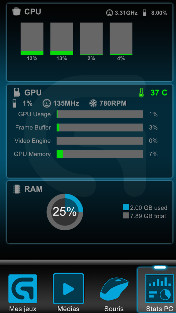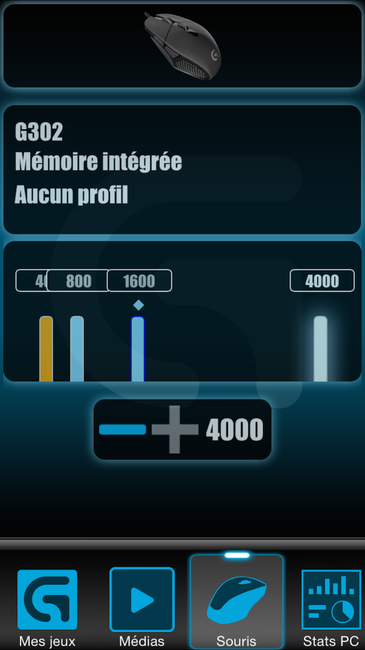 Enfin, l’application mobile de Logitech, Arx Control, est compatible avec la G302, On peut ainsi contrôler la sensibilité du capteur à la volée de même que les quatre paliers. L’application permet aussi de suivre les infos de son PC et également d’émuler une télécommande média.