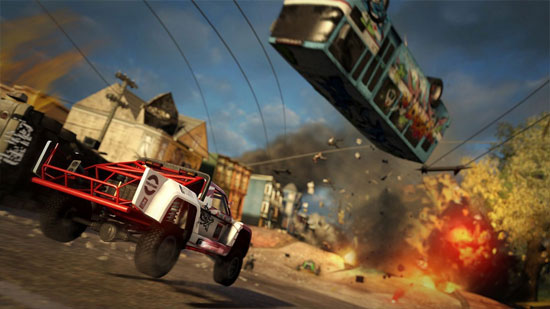 Pour cela, le boost est toujours disponible et sera à utiliser de manière stratégique afin que votre moteur n’explose pas. Rouler dans l’eau et votre moteur souffrira moins de son utilisation, rouler à travers les flammes d’une explosion et votre moteur chauffera beaucoup plus vite Il est toujours possible d’asséner des coups aux autres concurrents sous la forme de coup de poing/pied si vous êtes en moto ou en jouant de la tôle dans le cas contraire. L’IA des adversaires sans être révolutionnaire fait son boulot, vous envoyant valdinguer joyeusement mais aussi à enchainant les coups de vices entre eux. Au niveau graphisme, on en prend pleins les yeux, les véhicules sont bien modélisés mais c’est surtout les catastrophes naturelles qui sont bien rendues, feu d’artifice de particules de flamme, sable, poussière, eau, terre et surtout tôle froissée. On ajoutera que le titre supporte la 3D stéréoscopique. Pour l’avoir testé lors du dernier salon du jeu vidéo, la 3D prend ici tout son sens. On se retrouve au cœur de ce monde post apocalyptique. Mais vous ai-je parlé des trois vues disponibles dont une vue capot à couper le souffle, du circuit où l’on se fait canarder par des avions de chasse ? Non ? et bien à vous de le découvrir en vous essayant à MotorStorm : Apocalypse !