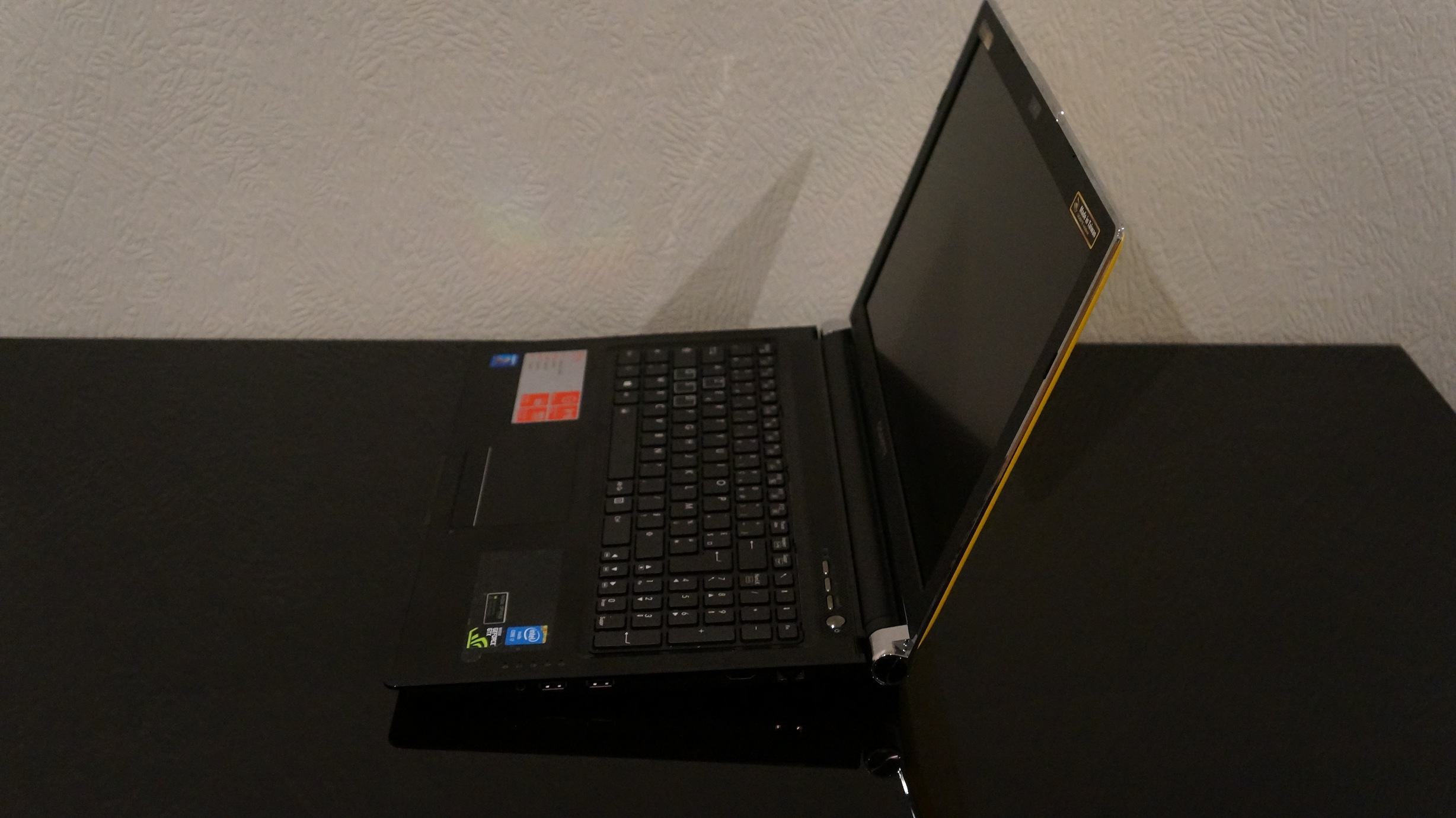 Coté design, j’ai envie de dire on aime ou on aime pas le capot jaune poussin. Personnellement, je n’aime pas beaucoup mais heureusement, le P25W existe aussi en noir. Pour le reste, je le trouve assez fin et avec une jolie forme. Il dispose d’un cadre couleur alu qui lui donne un petit coté premium pas désagréable. Par contre le clavier n’est pas top. N’espérez pas jouer avec, la course des touches est trop petite et le confort de jeu n’est donc pas optimal pour moi. A noter que le clavier est rétro-éclairé si besoin.