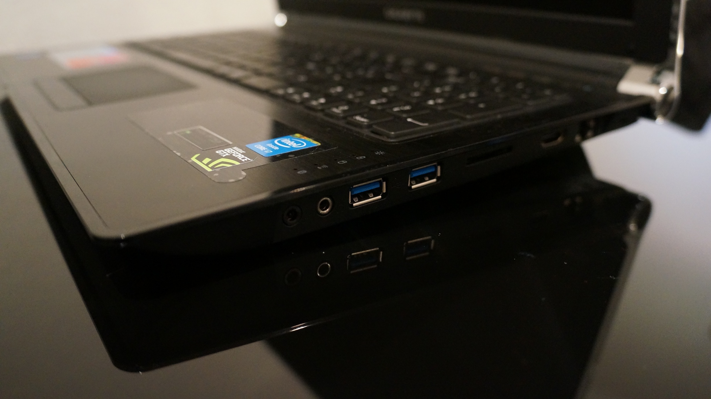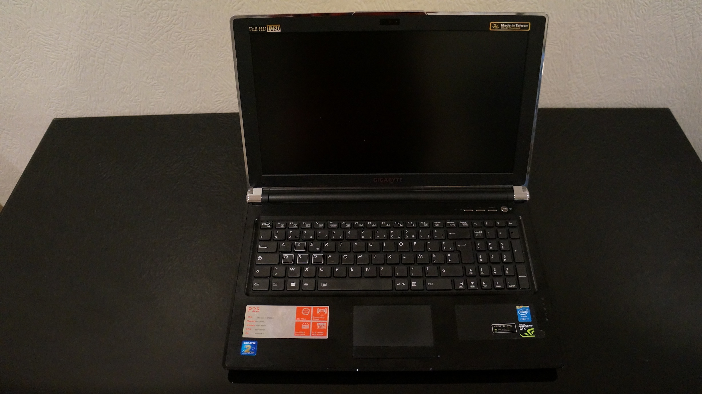 La configuration testée disposait d’un i7-4700MQ, de 8 Go de DDR3L, d’un disque dur SSD de 128 Go, d’un lecteur BD et de Windows 8. Passons le cas de Windows 8 dont l’interface à la Windows Phone m’horripile pour se concentrer sur la partie graphique. Le Gigabyte P25W fait un compromis entre le PC portable Gamer et le PC Ultra Gamer en proposant un combo nVidia GTX 770M / intel HD Graphics 4600. Pas de double carte graphique en SLI. Du coup, on gagne en finesse mais on perd en performance. Mais je vous rassure, la 770M se trouve dans le haut du panier sur portable et la plupart des jeux tourneront au max sur l’écran HD (1920×1080 pixels) mat du P25W. Et oui, j’ai bien dit mat, le graal pour tous les joueurs qui en ont marre des reflets sur leur écran (moi le premier). Par contre, je vous conseillerais d’upgrader le disque dur ! Si le SSD c’est top, 128 Go c’est trop peu pour un gamer, le moindre jeu tourne autour de 10 Go d’espace maintenant et WoW par exemple prend plus de 20 Go … vous voyez le tableau. Le P25W sera disponible en plusieurs configurations d’espace de stockage mêlant par exemple un SSD et un gros HDD classique. Enfin pour alimenter tout ça, on dispose d’une batterie 8 cellules (5700 mAh) assez fine. Enfin le poids total tourne autour de 2,8 Kg en comptant la batterie.